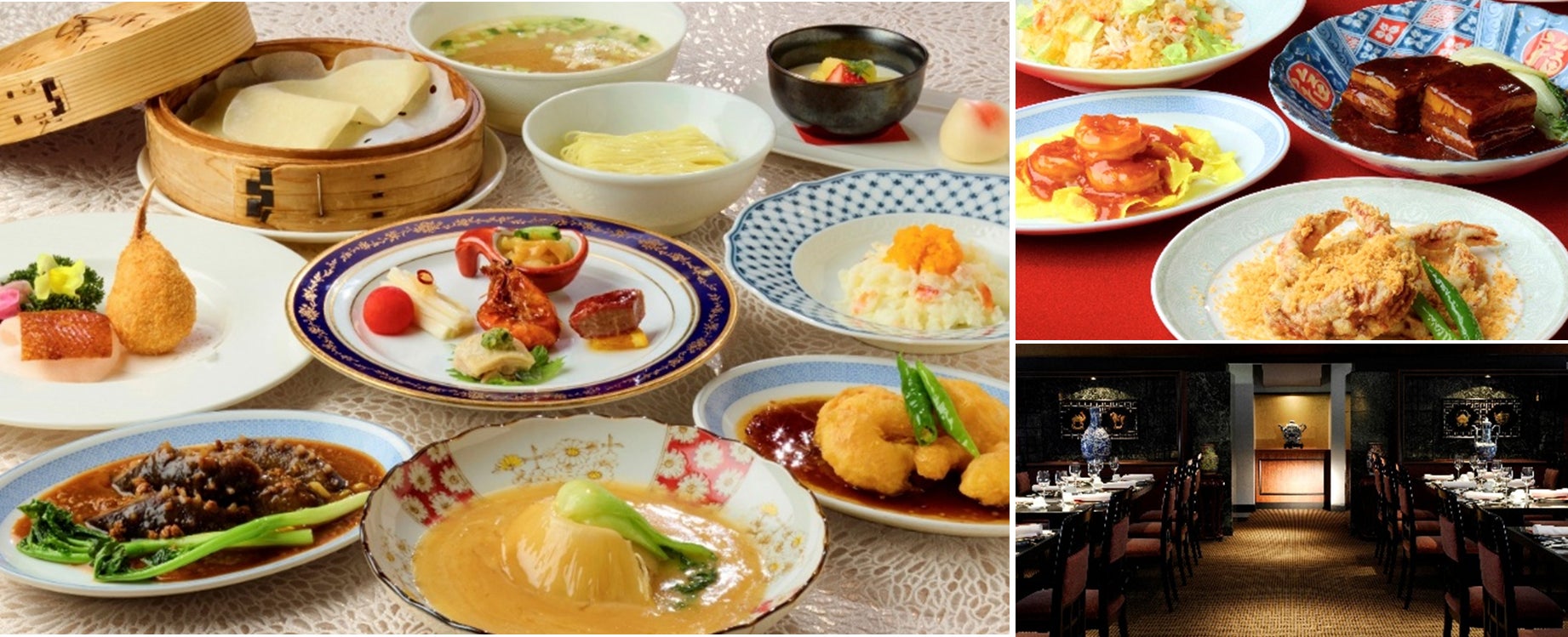 天壇王府時代に支持を集めた、北京・山東料理の特長を生かしたコース「龍鳳 源流コース」(写真左)。そして、現在の皇家龍鳳を象徴する、広東・広州料理の洗練を表現したコース「龍鳳 昇流コース」(写真右上)。新・旧、それぞれ異なる魅力を存分にご堪能いただけます。新旧のエッセンスを融合した前菜と北京ダック、蟹爪にはじまり、その後は、各コースの特長や風味を色濃く映すひと品をお選びいただけます。原点から現在までの伝統と進化を辿る、今だけの食体験をお楽しみいただけます。