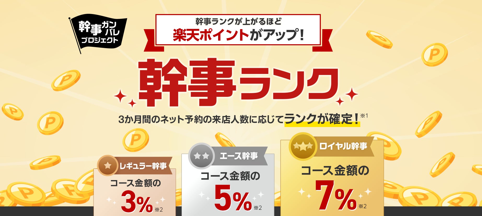 当社では、宴会需要の喚起による飲食業界の活性化を目指し、“繰り返し利用するほど” “大勢で集まるほど” より多くの楽天ポイントが貯まる「幹事ランク制度」を展開・推進しています。