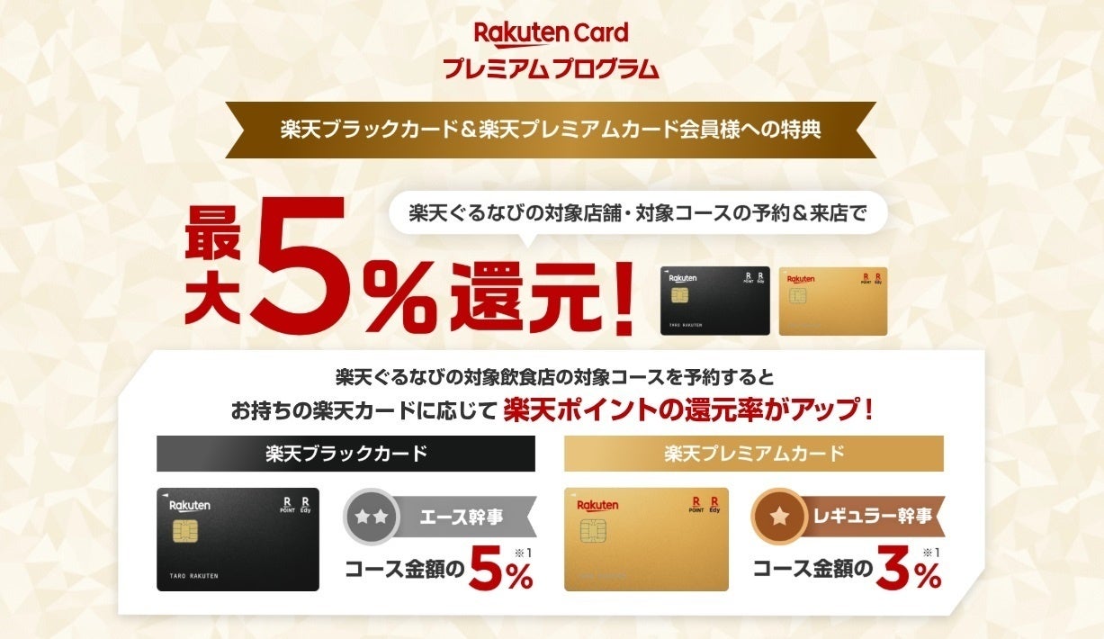 なお、2025年10月より開始した楽天カード㈱との連携により、楽天IDとぐるなびIDの連携をされているブラックカード会員様には「エース幹事(ポイント還元率:コース金額の5%分)」、プレミアムカード会員様には「レギュラー会員(同3%分)」のランクが自動付与されています。