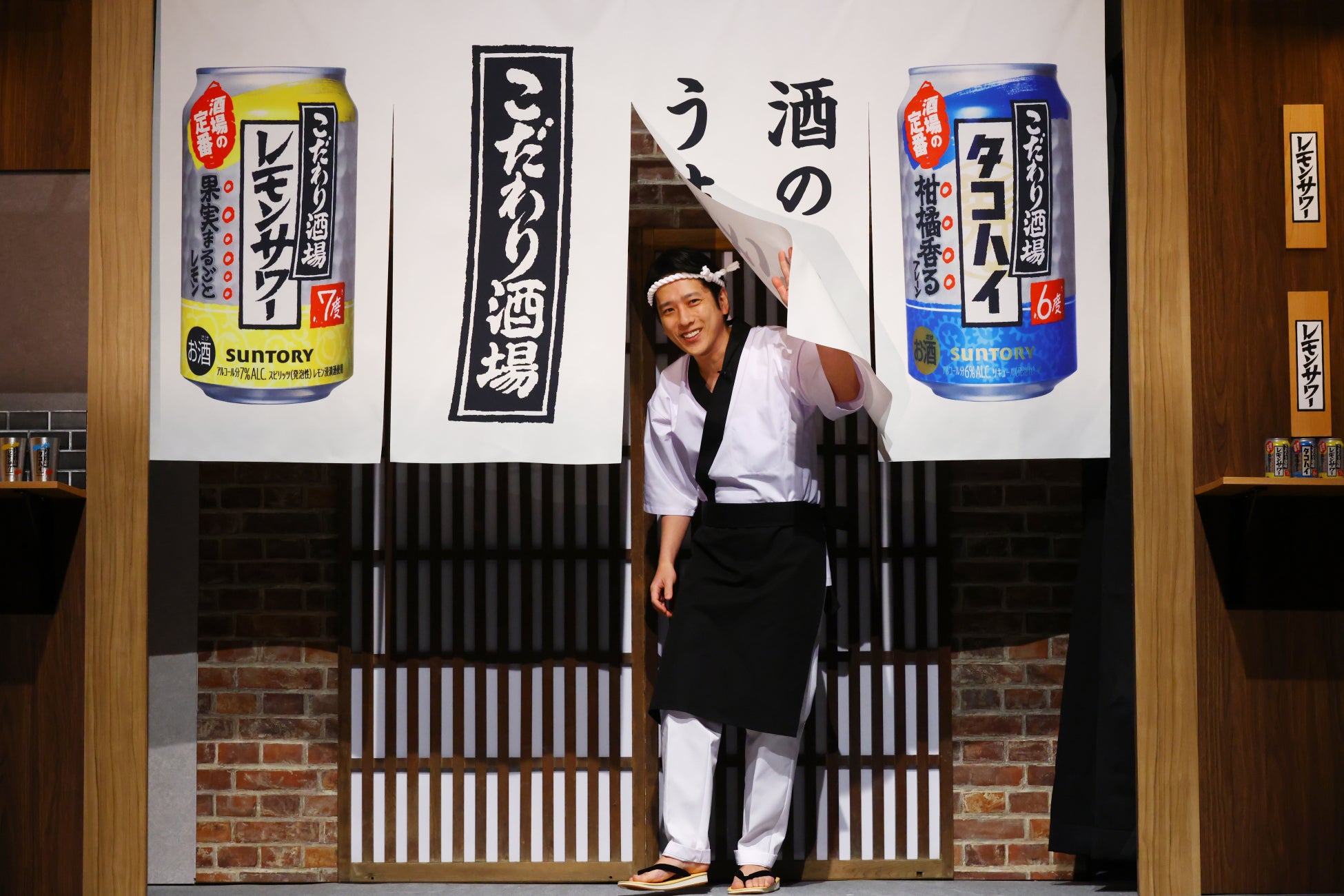 CM上映後、新CMで”大将役”を務める俳優・二宮さんが登壇。CMの世界観そのままに、ハチマキと前掛けの大将スタイルで、のれんをくぐって登場されました。居酒屋風のセットとマッチした出で立ちに、会場からは温かい拍手が送られました。