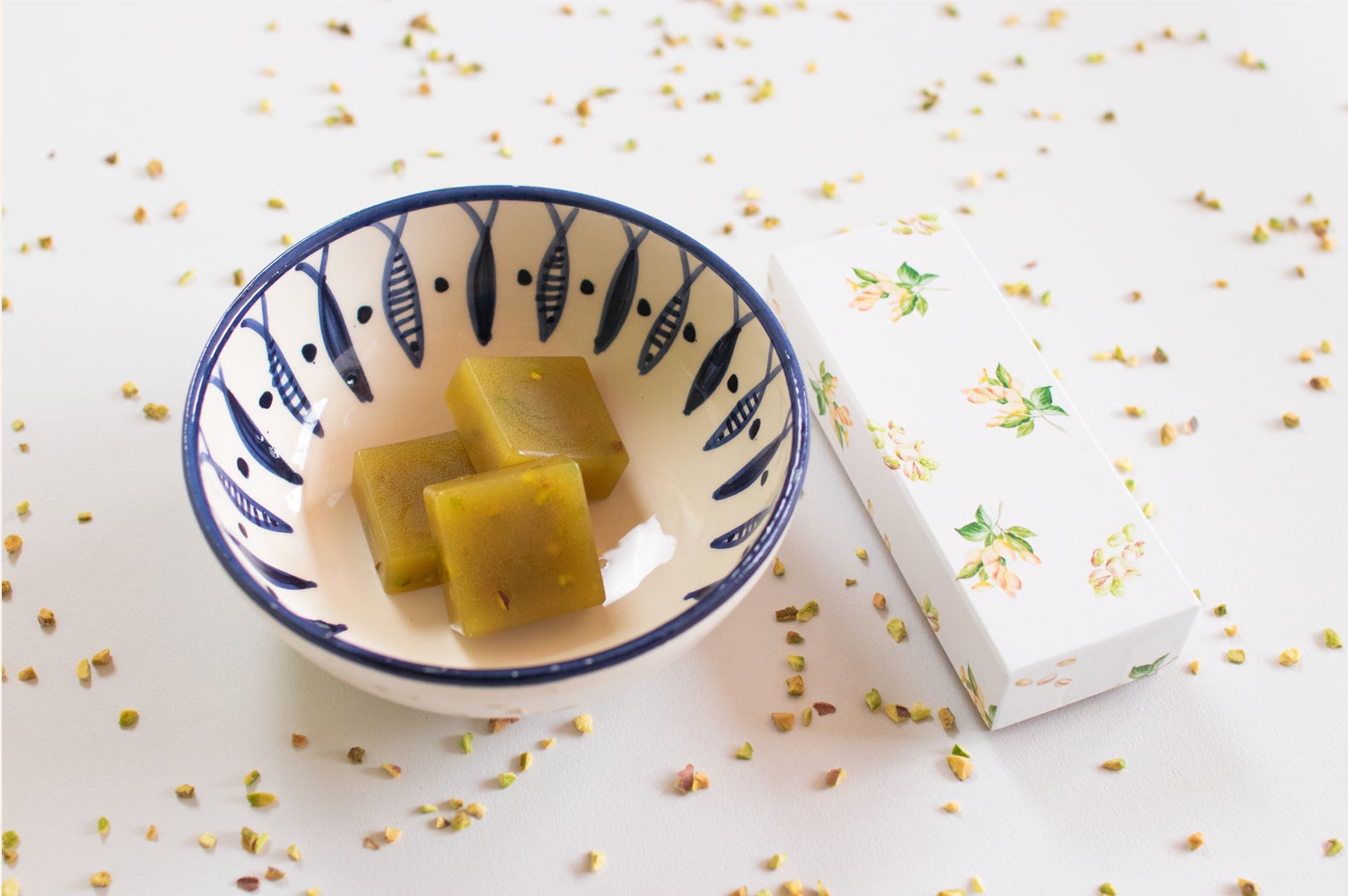 ピスタチオ羊羹の上には、ピスタチオの浮島を合わせた、ピスタチオ好きに贈る和菓子です。