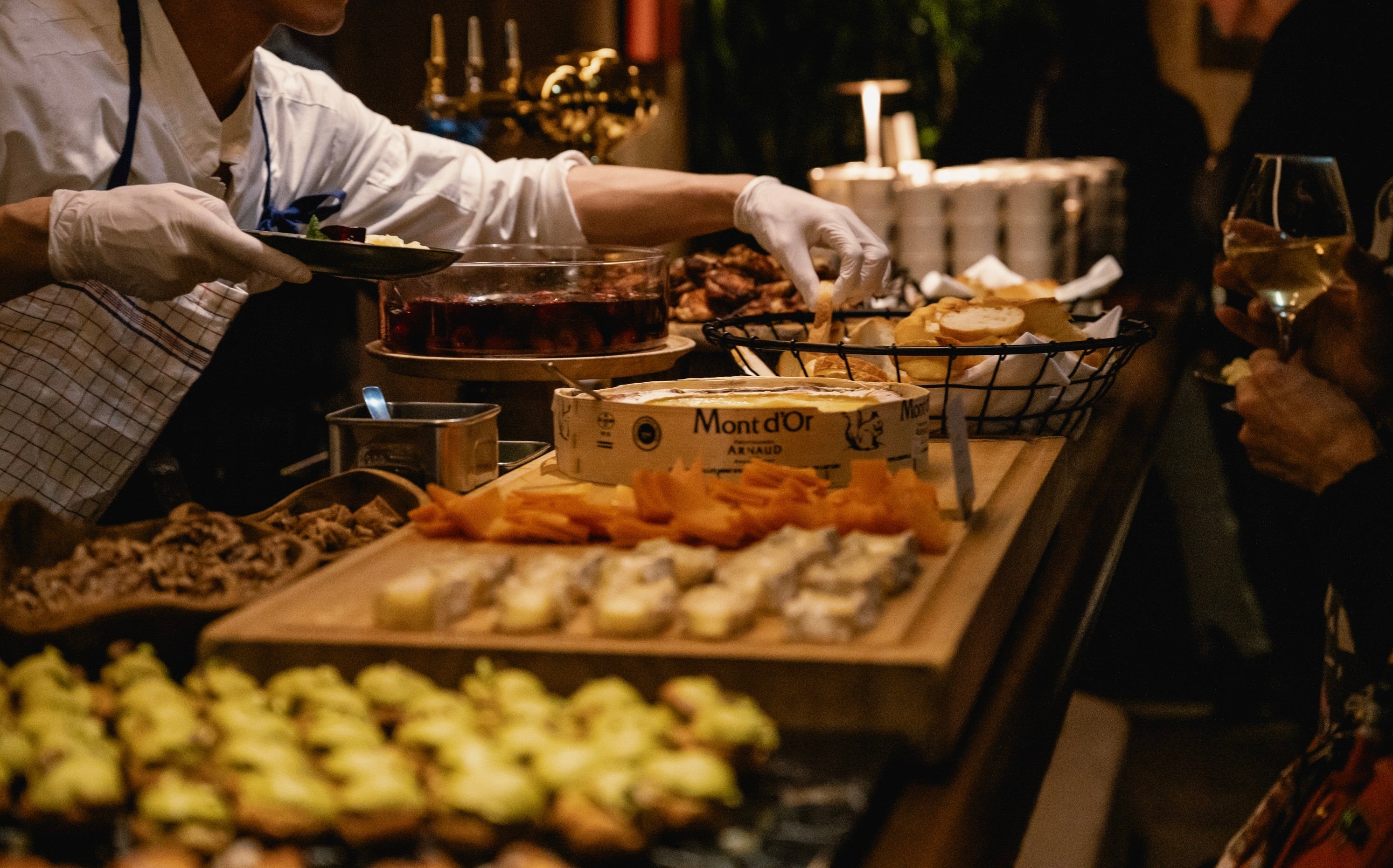⿊岩⼟鶏冷製ハム/セロリラーブとカニのパスカード/カシューナッツのヴィーガンディップ/豚頬⾁コンフィの⾹草ブイヨン/桜鯛・桜エビと⼭菜のプレッセ/もち豚とキャベツ・⾙柱シュウマイ/デコポンと⼋朔・⾦柑のサラダ/カヌレ2種(⾹草バター・いちじくバター)/蝦夷⿅⾁とプラムのコンポート/⽩レバーのムース・⾚ワインのジュレ/⾖乳とリコッタのムース