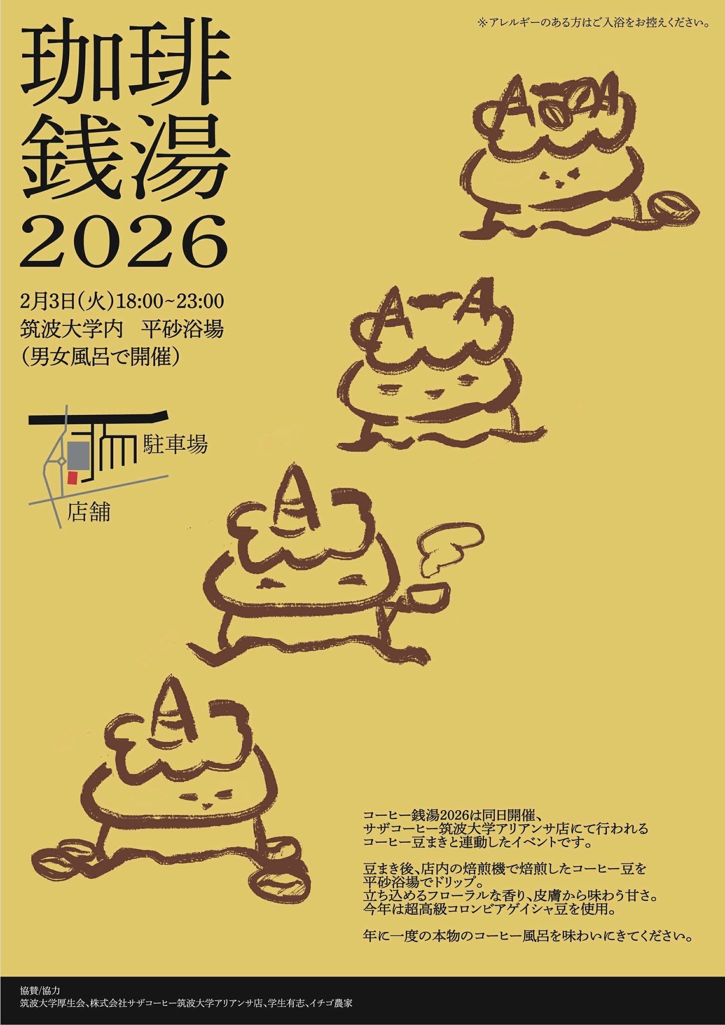 2026年の節分(2月3日)に茨城県つくば市の筑波大学内にあるサザコーヒー筑波大学アリアンサ店でサザコーヒー恒例のコーヒー豆まき&珈琲風呂が行われ全イベント参加者が無病息災と今年の夢を祈った。サザコーヒー(代表:鈴木太郎)は今年の豆まきに香りの強いコロンビアの自社農園のゲイシャコーヒーを100kg 惜しみなく使った。豆まきイベントは昼12時に開始されおおよそ70人が参加した。豆まきを経過した原料を店内の焙煎機で再び焙煎し筑波大学内の銭湯で「珈琲風呂」を今年も行い、スタッフも含めおおよそ100人が香りの強いゲイシャコーヒー風呂を堪能した。またサザコーヒー店の取引先のいちご農園に使用した縁起の良いコーヒー抽出かすを来年のいちごの栄養になるようにコンポスト肥料の材料として提出した。