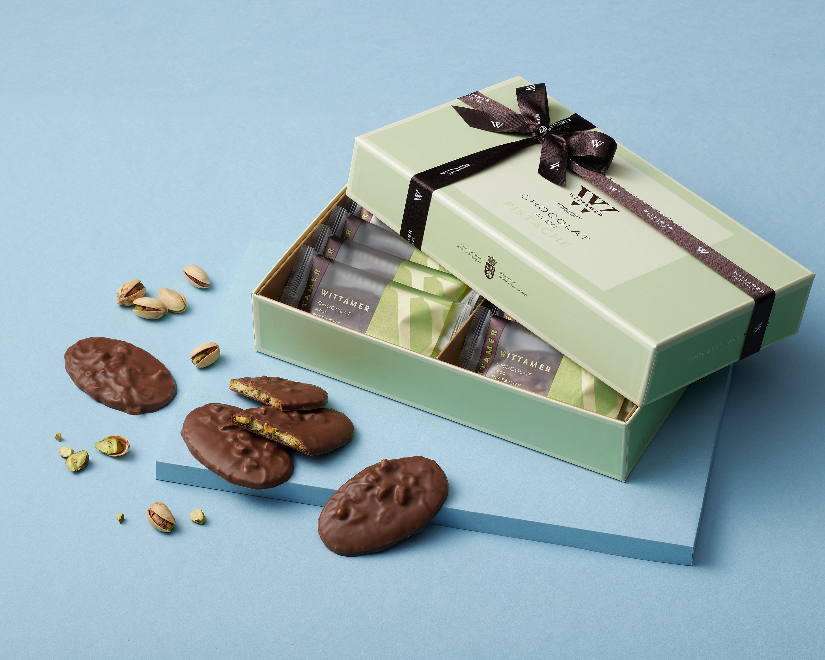 そのサクサクほろほろとした食感はそのままに、ピスタチオペーストを練り込んだサブレにピスタチオをのせ、ミルクチョコレートで包んだ “ピスタチオ・ショコラ” を今年もご用意しました。