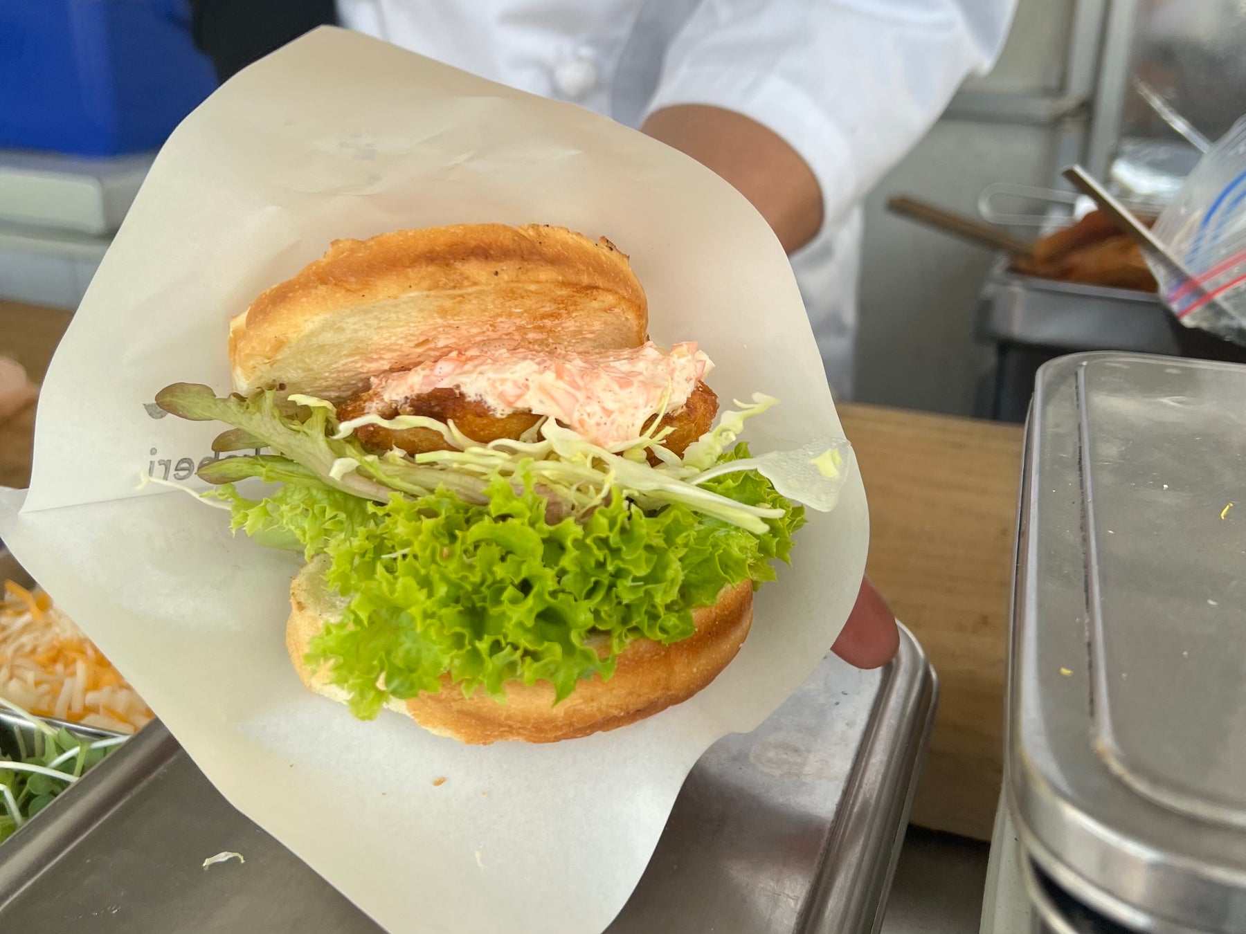 学校栄養士考案のにんじんタルタルと麹ドレッシングのバーガーを提供。