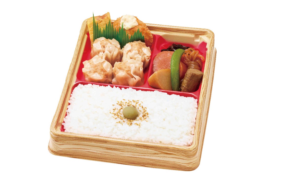 国産の豚肉、玉ねぎ、しょうがを使用した、お肉の旨みたっぷりのジューシーなシュウマイを、お店で丁寧にせいろで蒸しました。だし香る懐かしい味わいの根菜の甘辛煮や、人気のポップコーンシュリンプ、たまごやきと椎茸昆布など、しっかり満腹感もあるお弁当です。
