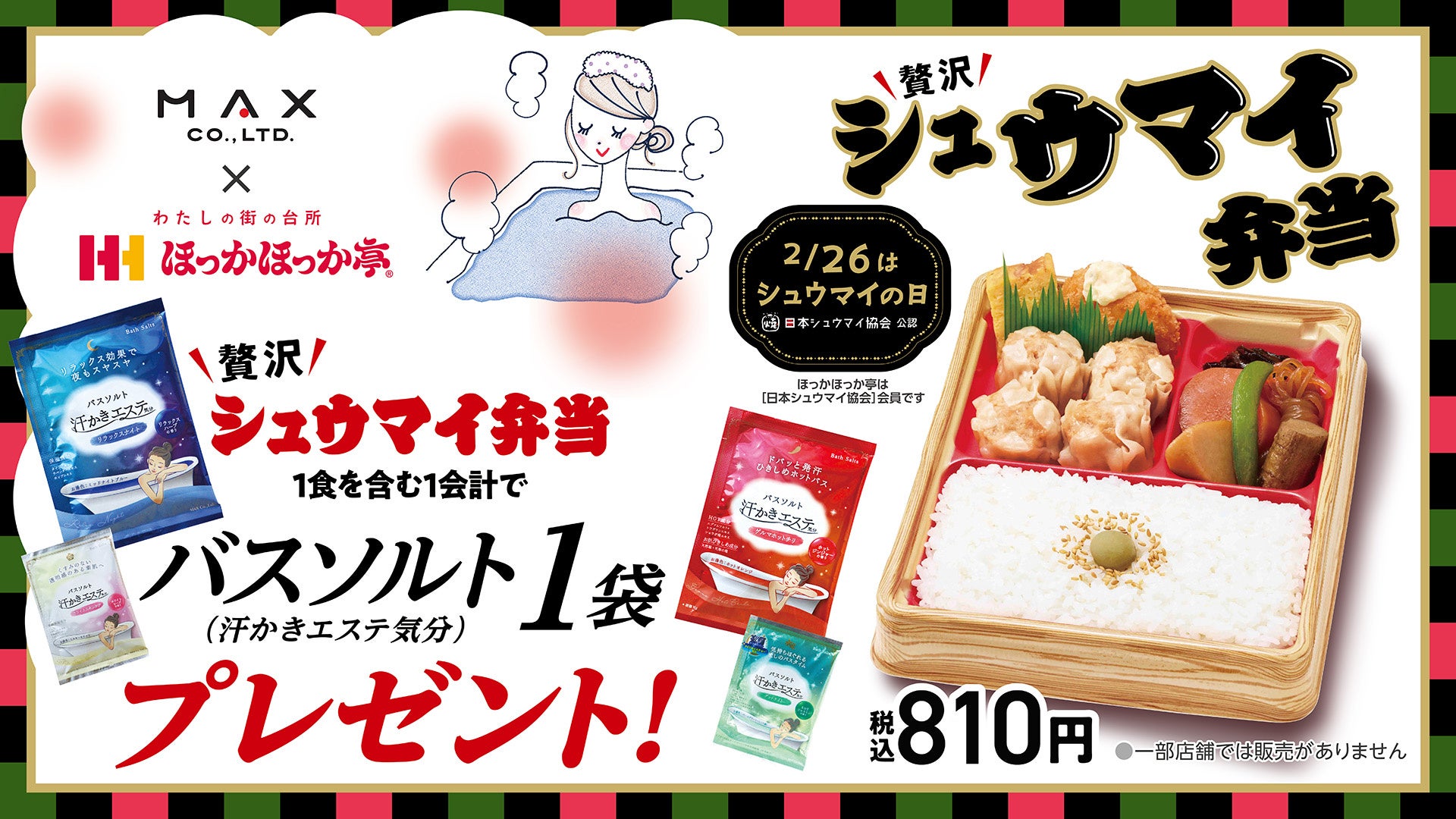 持ち帰り弁当事業のパイオニアである「株式会社ほっかほっか亭総本部」(本社:大阪府大阪市、代表取締役会長兼社長:青木達也)は、スキンケア・ボディケア・ヘアケア製品の企画・製造を手がける「株式会社マックス」(本社:大阪府八尾市、代表取締役社長 大野 範子、以下「マックス社」)との異業種コラボレーション企画として、“風呂の日”である2026年2月6日(金)より、「\贅沢/シュウマイ弁当」をご購入のお客さまに、バスソルト「汗かきエステ気分」をプレゼントするキャンペーンを実施いたします。