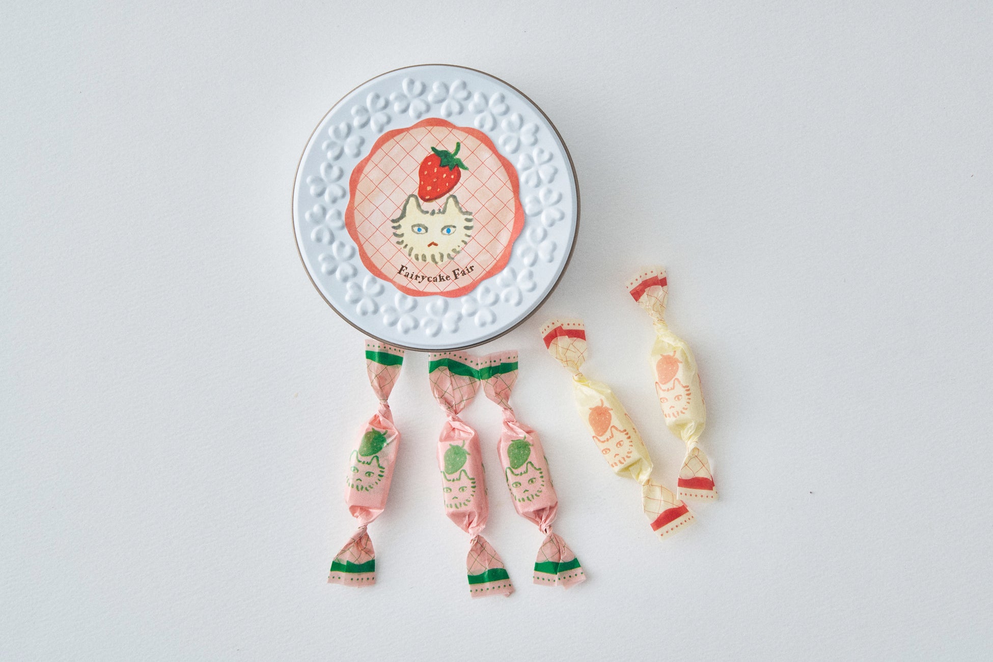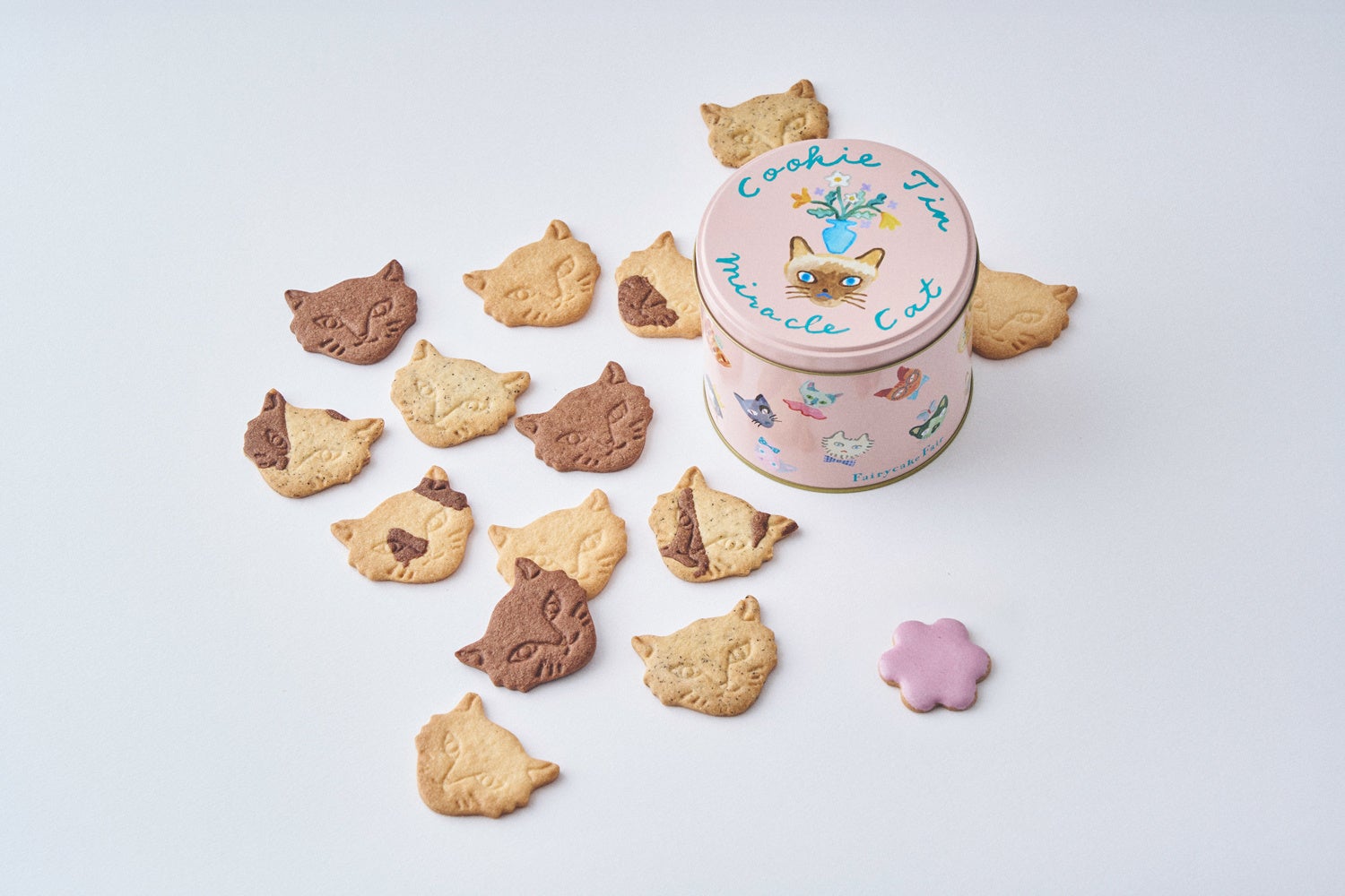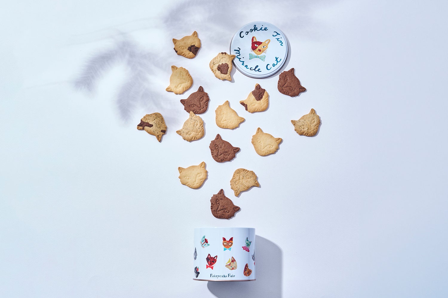 “神様のいたずら”のような、不思議な模様やユニークな特徴をもつミラクルキャットたちの愛おしさを伝えたくてうまれたお菓子。ミュージシャン・坂本美雨さん、イラストレーター・前田ひさえさん、フェアリーケーキフェアとの共同制作によって2021年にデビューした大人気のネコクッキー缶です。