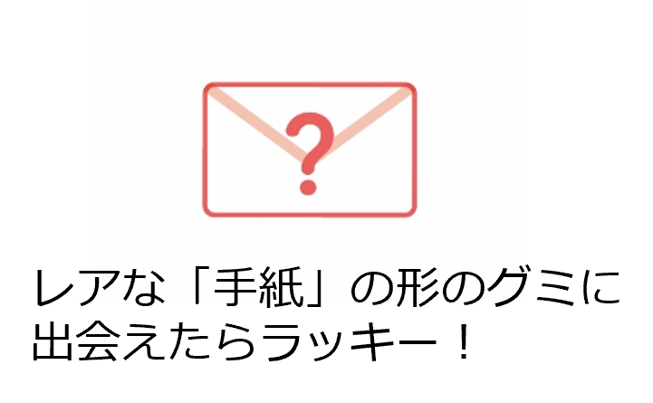 赤と黄色の2色の花びら型のグミを並べて、一輪の梅の花を作ることもできます。また手紙の形をした、レアな形のグミもありますので、ぜひ探してみてください。