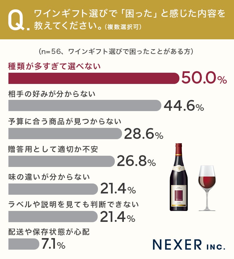 今回の調査では、ワインギフトを選ぶ際に最も重視されているのは「相手の好み」であることがわかりました。一方で、約4割以上の人がワインギフト選びで困った経験があり、その主な理由として「種類が多すぎて選べない」といった意見が半数を占めています。