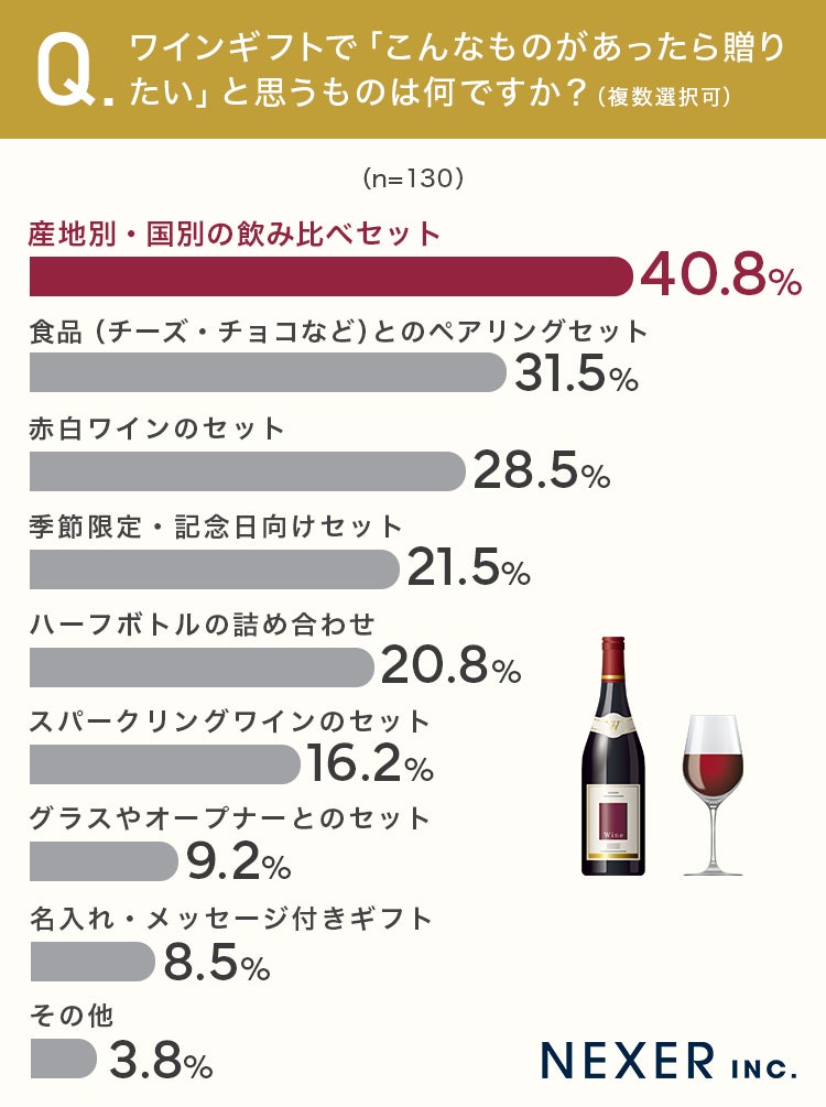 多くの人がさまざまな地域のワインを楽しみながら選びたいと考えていることがわかります。また「季節限定・記念日向けセット」は21.5%、「ハーフボトルの詰め合わせ」は20.8%と、特別感のある商品や少量ずつ楽しめる商品への需要も高いことがわかりました。