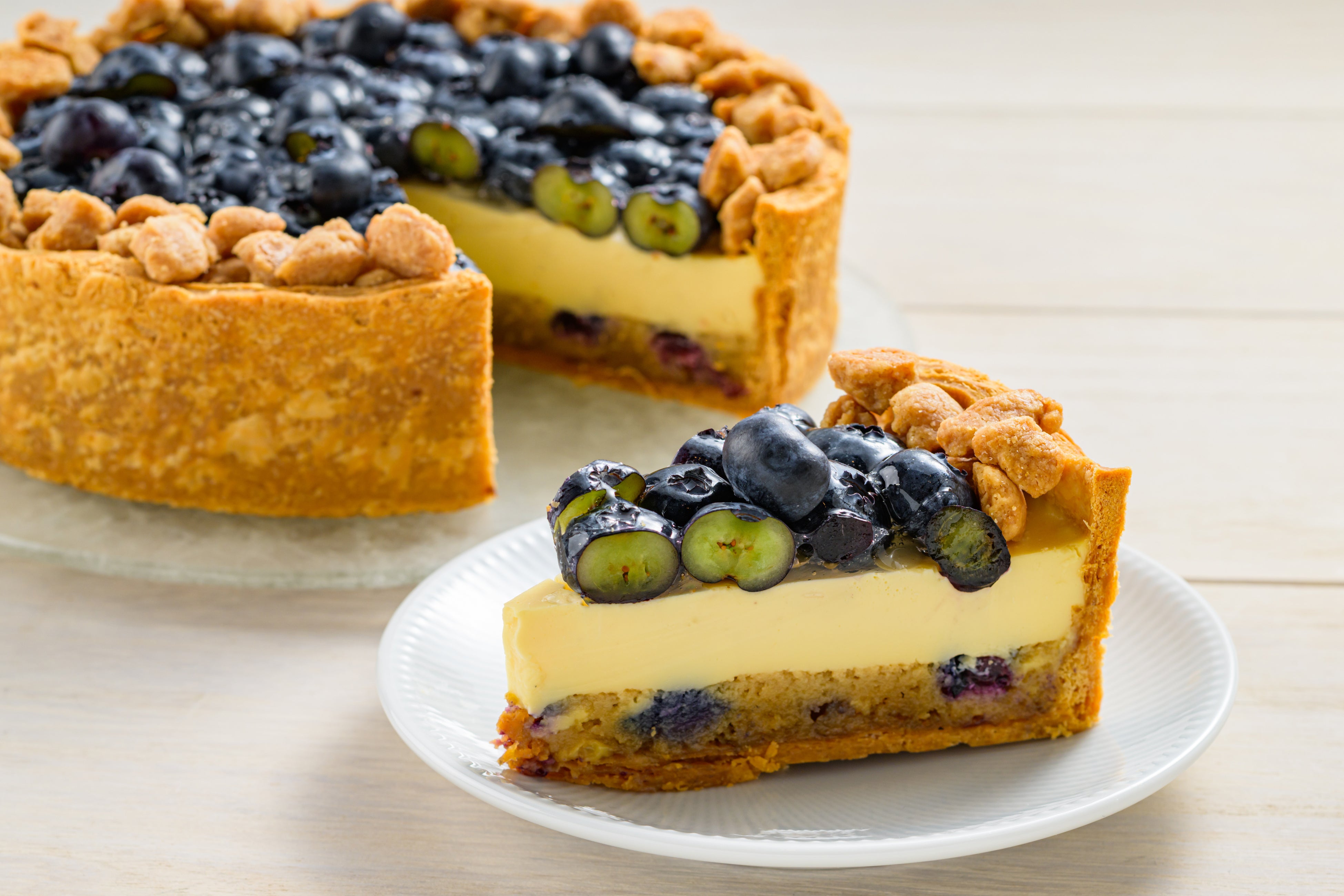 なめらかでやさしい味わいの豆乳ムースと黒蜜を加えてじっくり焼き上げたアーモンドクリーム生地を合わせたタルトです。豆乳の風味を生かしたムースをたっぷりのせたみずみずしいブルーベリーとともにお楽しみください。