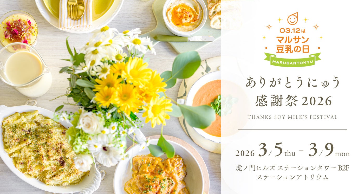 マルサンアイ株式会社(本社:愛知県岡崎市、代表取締役社長:稲垣 宏之)は、2026年3月5日(木)~3月9日(月)の5日間限定で、体験型ポップアップイベント「03月12日はマルサン豆乳の日 ありがとうにゅう感謝祭 2026」を 虎ノ門ヒルズ ステーションタワーB2F ステーションアトリウムにて開催いたします。