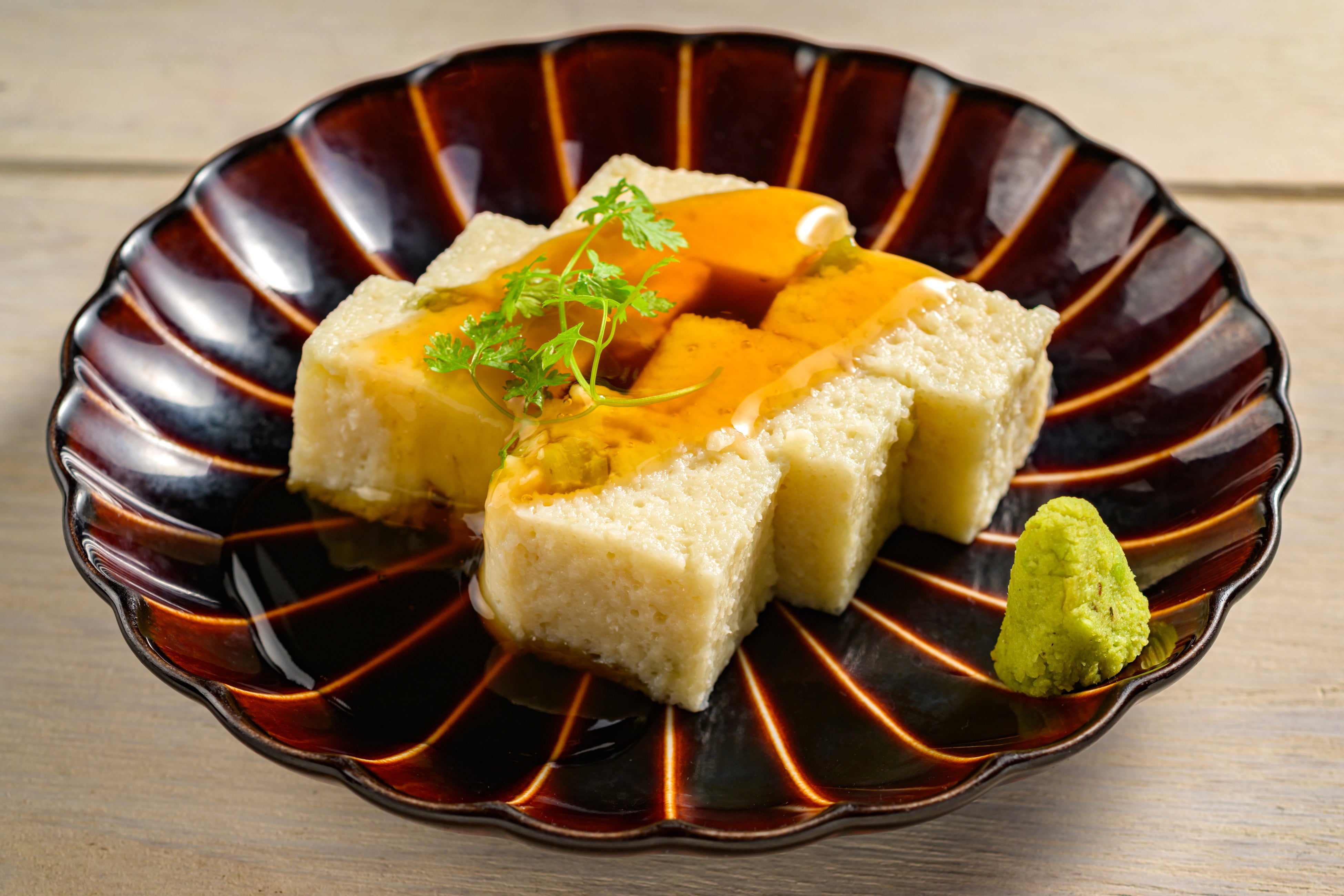 すりおろした山芋の粘りを豆乳のコクでまとめた、とろける食感の豆乳寄せです。わさびを合わせることで、香りと後味のキレを良く仕上げました。豆乳により山芋の角が取れ、やさしい甘みとコクが口の中に広がります。ランチメニュー「おお島の和定食」でも小鉢で提供します。