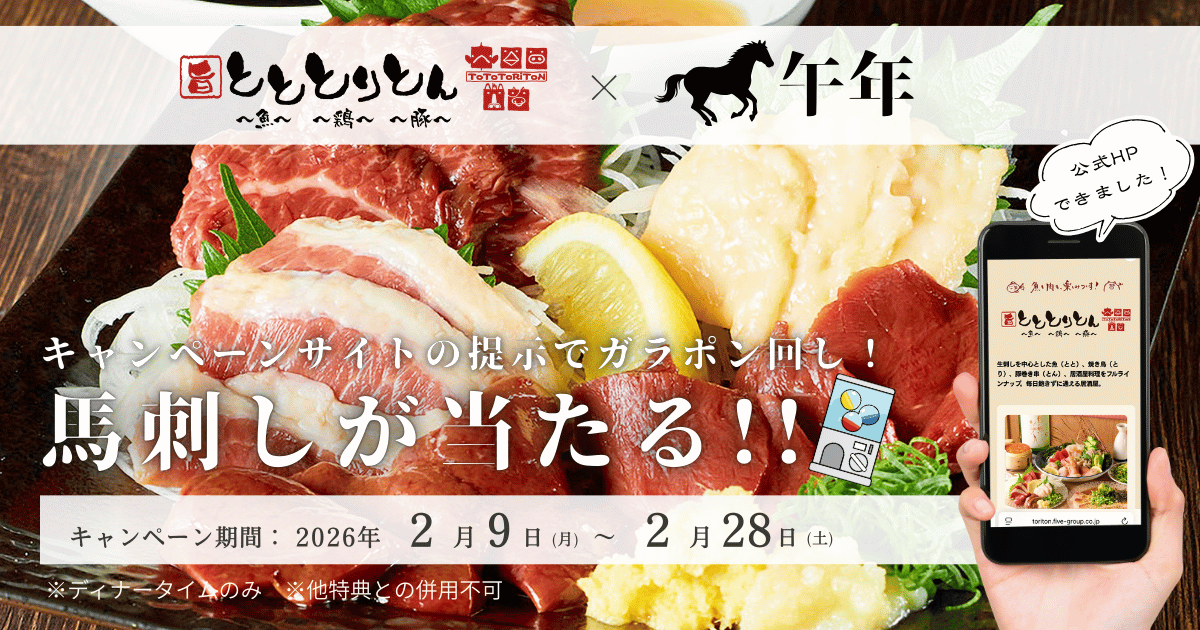 「”楽しい”でつながる世界をつくる」を経営理念とする飲食企業の株式会社ファイブグループ(本社:東京都武蔵野市 代表取締役社長:坂本憲史 以下ファイブグループ)が展開する居酒屋ブランド「とととりとん」は、2026年2月9日(月)から2月28日(土)までの期間、全6店舗にて、ブランド公式ページをご提示いただいたお客様全員に店頭でガラポンができる抽選キャンペーンを開催します。