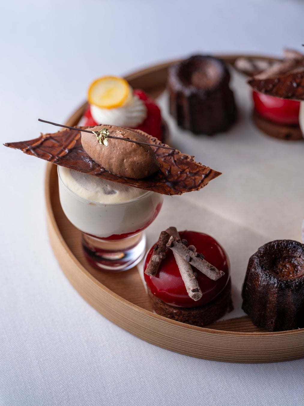 スイーツには、ラズベリーの酸味が際立つガナッシュタルトをはじめ、なめらかなチョコレートムース、香ばしく焼き上げたチョコレートカヌレ、そして余韻まで甘美に包み込むチョコレートパルフェをご用意しました。チョコレートとベリーが奏でる奥行きのある味わいが、ヴァレンタインの高揚感を優雅に引き立てます。