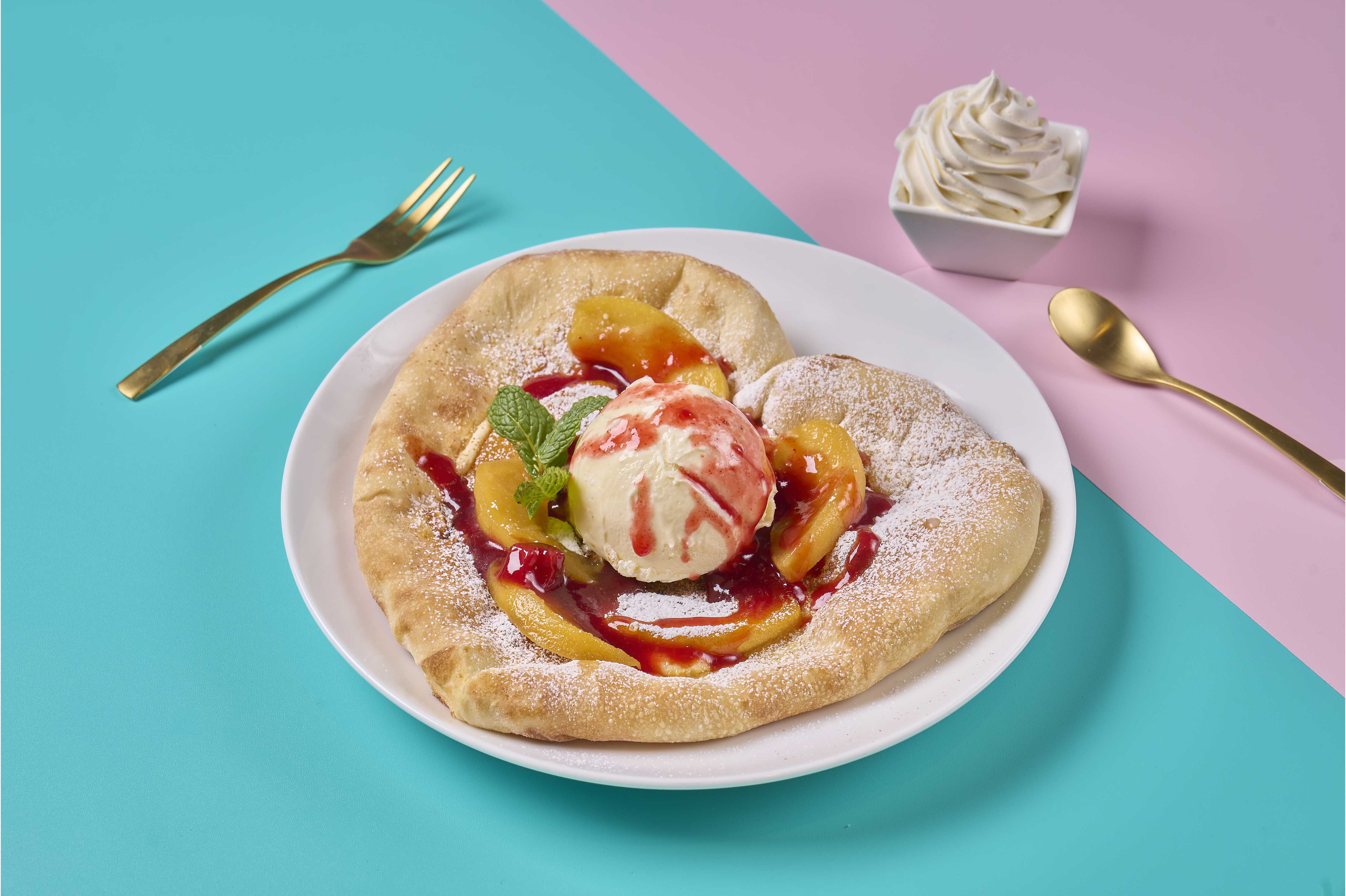 「アップルベリーキャラメルピザ」は、ハート形のピザに、キャラメリゼした林檎とベリーソースをトッピング。仕上げにのせたバニラアイスが熱々のピザの上で程よく溶け合い、ひんやり×あたたかの絶妙なハーモニーを楽しめます。フルーティーな甘酸っぱさとコクのある甘さが広がるデザートにぴったりの1枚です。