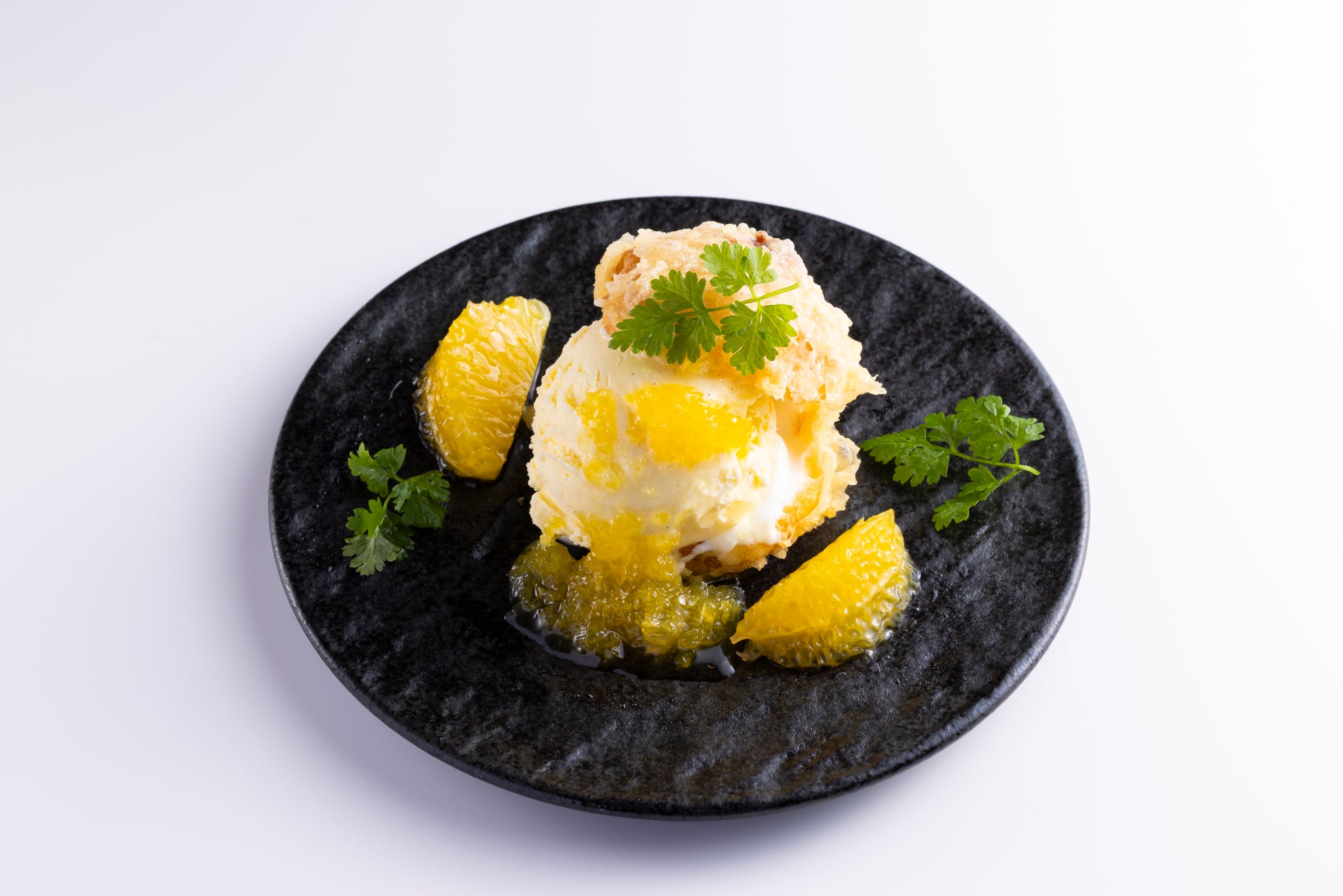 シューアイスの天ぷらに、さらにバニラアイスをプラス。その甘さにバランス良く寄り添うのが、シロップ漬けにしたはっさくの粒感のあるソース。ほのかな苦みとアイスのハーモニーをお楽しみください。