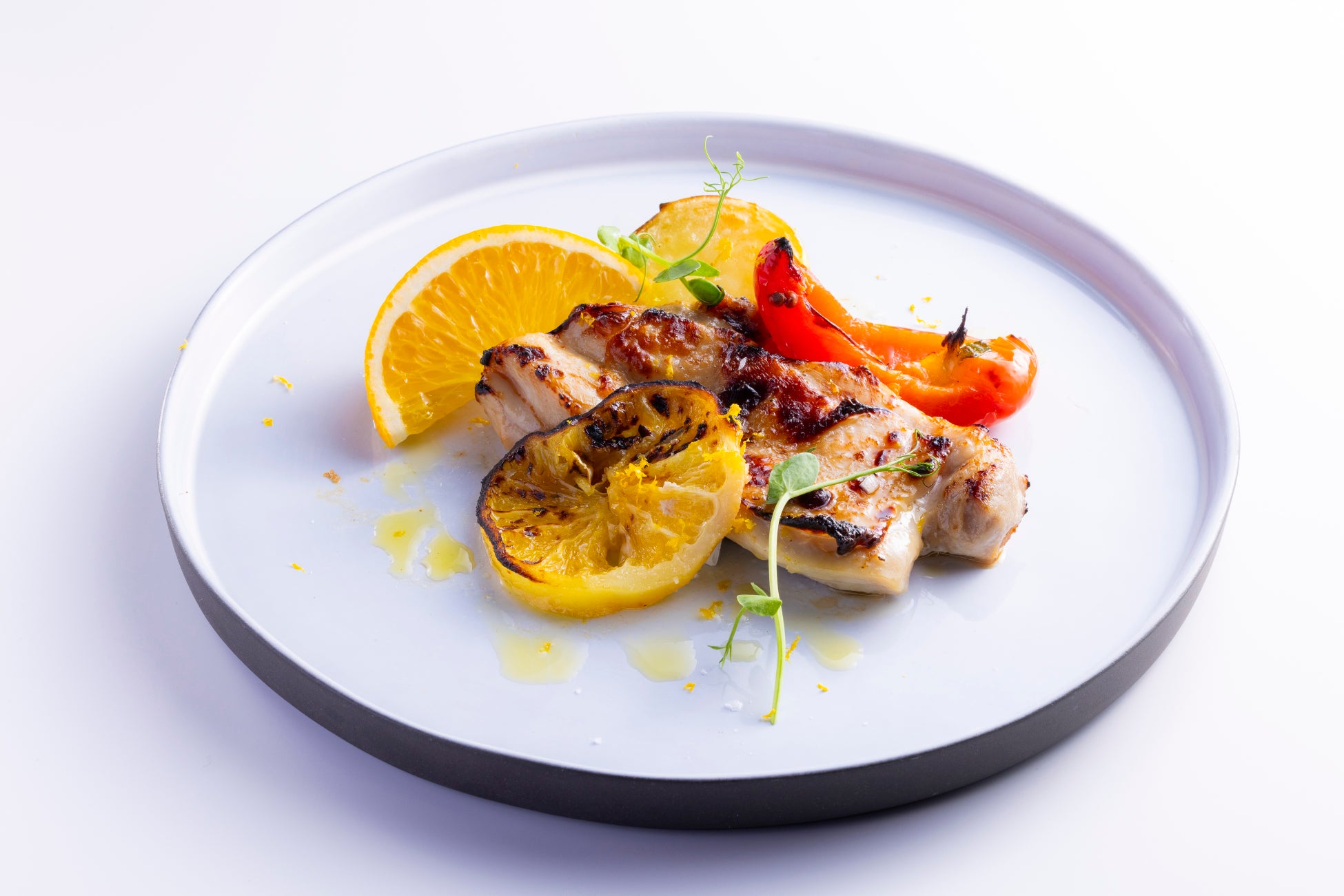 チキンをはっさくの果汁と塩麹のマリネ液に漬け込み、石窯で焼き上げた一品。ローストしたはっさくには少し苦みがあるので、白ワインとのペアリングがおすすめ。