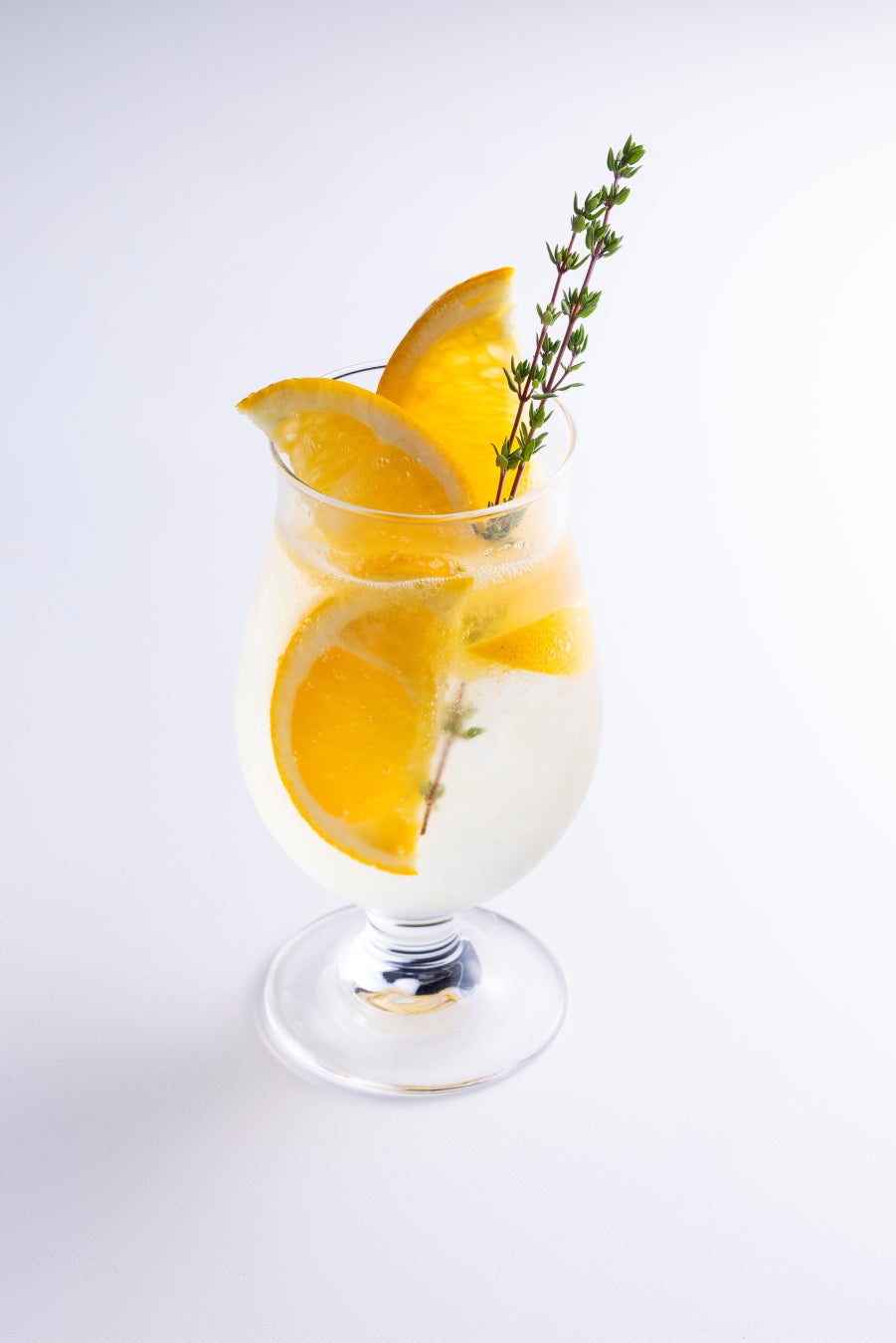 爽やかな香りを放つ和歌山県産の高野槙の葉をキーボタニカルに据えたクラフトジン「KOZUE」に、はっさく1個を使用した贅沢なジントニック。仕上げはタイムの葉を添えて。馥郁たる香りの奥深い味わい。
