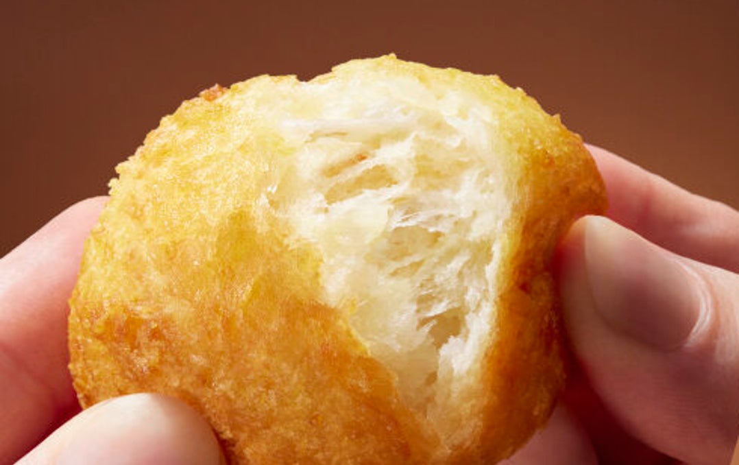 お店でうどんをミキサーにかけてペースト状に。数時間おきにひく白だしを生地に加えるのが丸亀製麺ならではのこだわり。旨みと香り高い風味をプラスします。もっちもち食感を生みだすために空気を含ませながらやさしく粉と混ぜ合わせ、生地を少し寝かせます。丸い形に整えて、ひとつずつ丁寧に揚げたらできあがり。手づくりならではの素朴なおいしさをお楽しみください。