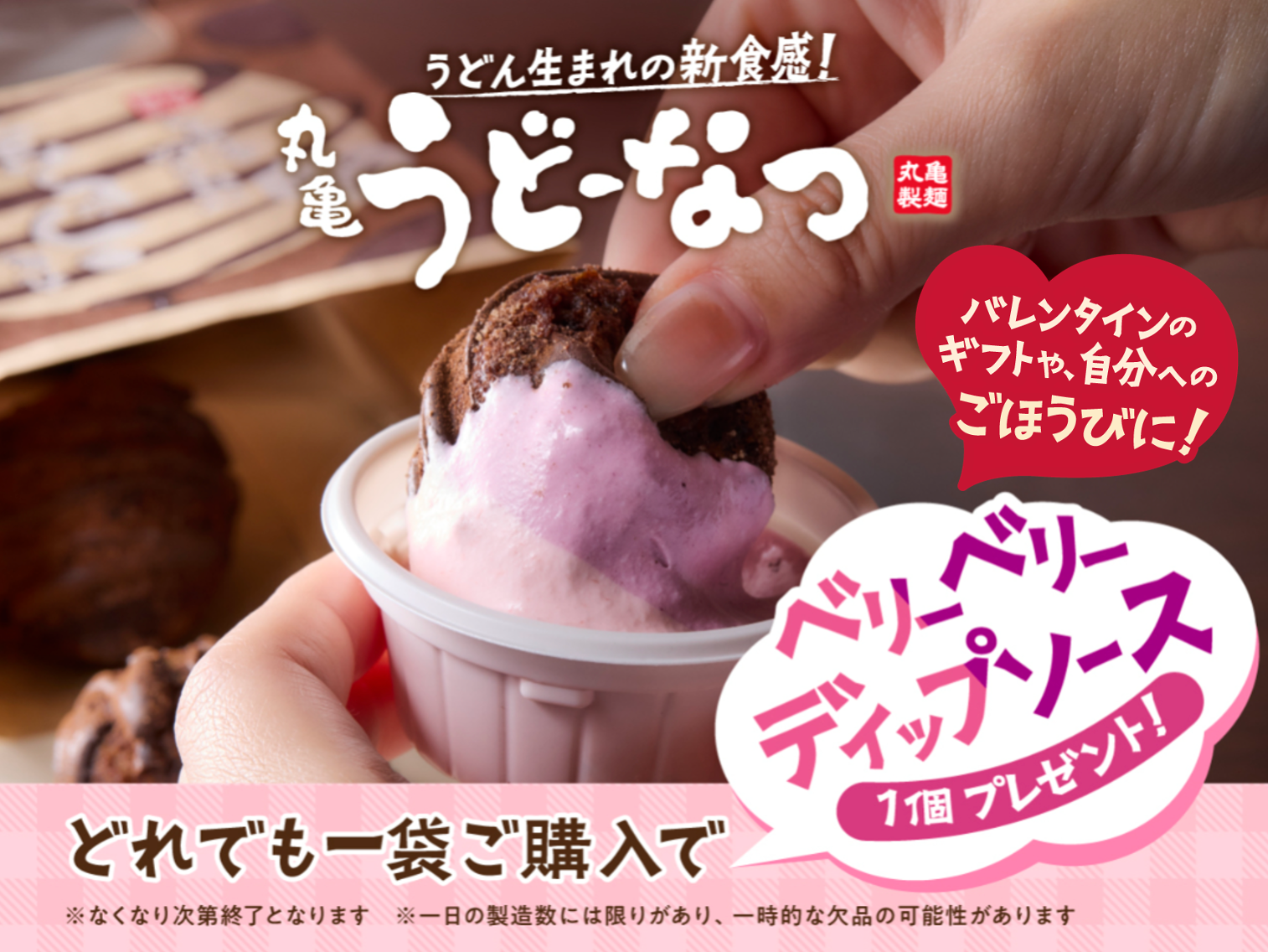 株式会社丸亀製麺(本社:東京都渋谷区、代表取締役社長:山口 寛)が展開する、食の感動体験を探求し、手づくり・できたてにこだわる讃岐うどん専門店「丸亀製麺」は、バレンタインシーズンに合わせ、2026年2月9日(月)から2月15日(日)までの1週間限定で、「丸亀うどーなつ」1袋通常5個入りを3個増量し、8個入りでお値段そのままでご提供いたします。また、「丸亀うどーなつ」をご購入のお客さまを対象に、特製の「ベリーベリーディップソース」を3月2日(月)までの期間限定で無料でお渡しします。