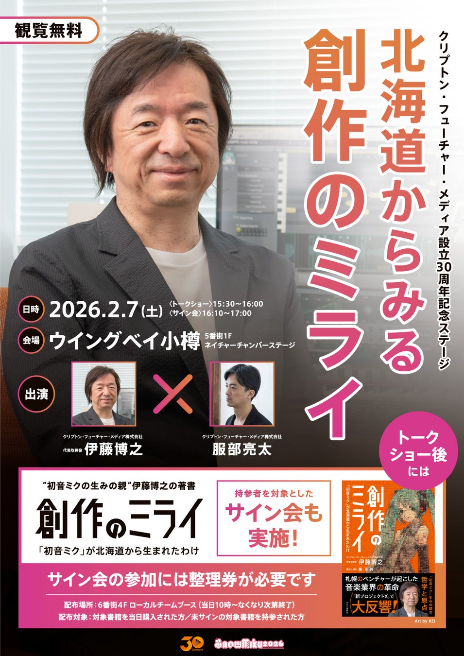 加えて、今年のステージではクリプトン・フューチャー・メディアの設立30周年を記念して、7日(土)に当社の代表・伊藤博之が地元・北海道からみる創作のミライについて語るトークショーも行います。トークショーはライブ配信も行いますので、当社がどのような想いで「SNOW MIKU」をはじめとしたローカルプロジェクトに取り組んでいるか、気になる方はぜひご覧ください。