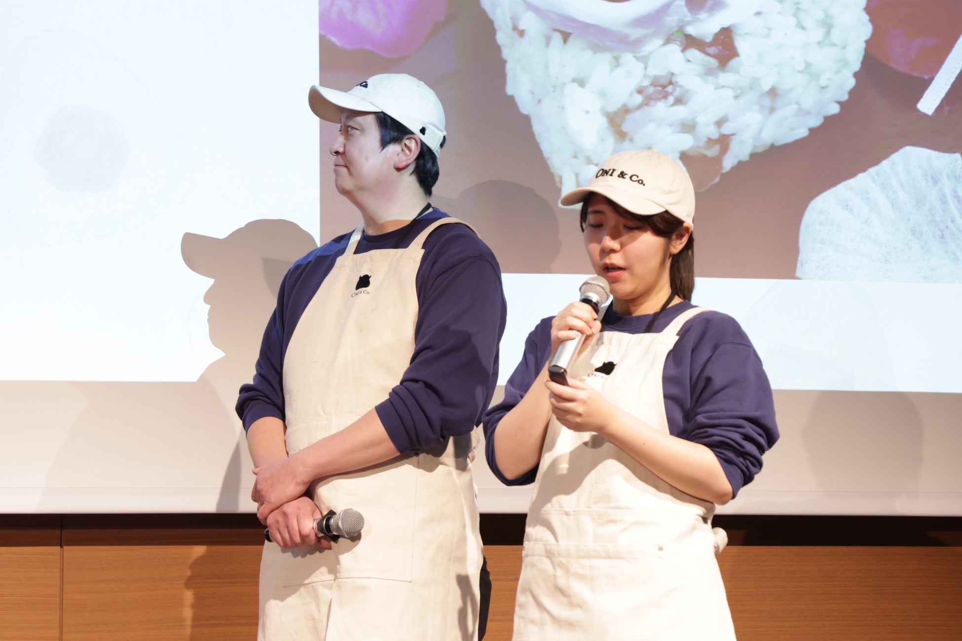 また会場では、各自治体オリジナルの「ご当地おにぎり」に加え、ONI&Co.による「バレンタインおにぎり」が発表されました。壇上では、”生ハム侍”菅野亮介氏(株式会社HAMONS代表取締役)による生ハムカットとともに、「バレンタインおにぎり」の魅力をアピール。女優の本間日陽さんによる試食も行われ「お米のおいしさと、トマト、バジル、チーズが全部合わさっていて、新しい感覚のおにぎりだと思いました。噛めば噛むほど生ハムの食感、バジルの香りが抜けていくのがいいなと思いました」と、その味わいを絶賛しました。