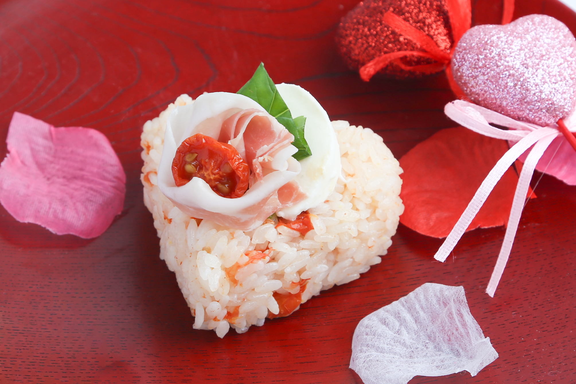 自家製セミドライトマトを混ぜ込み、想いを込めてハート型に結んだ炊き込みご飯。その上に、旨みが凝縮した生ハム、みずみずしくミルキーなモッツァレラ、風味豊かなフレッシュバジル、そして自家製のセミドライトマトを重ね、イタリアンの定番「カプレーゼ」をおにぎりで表現しました。
