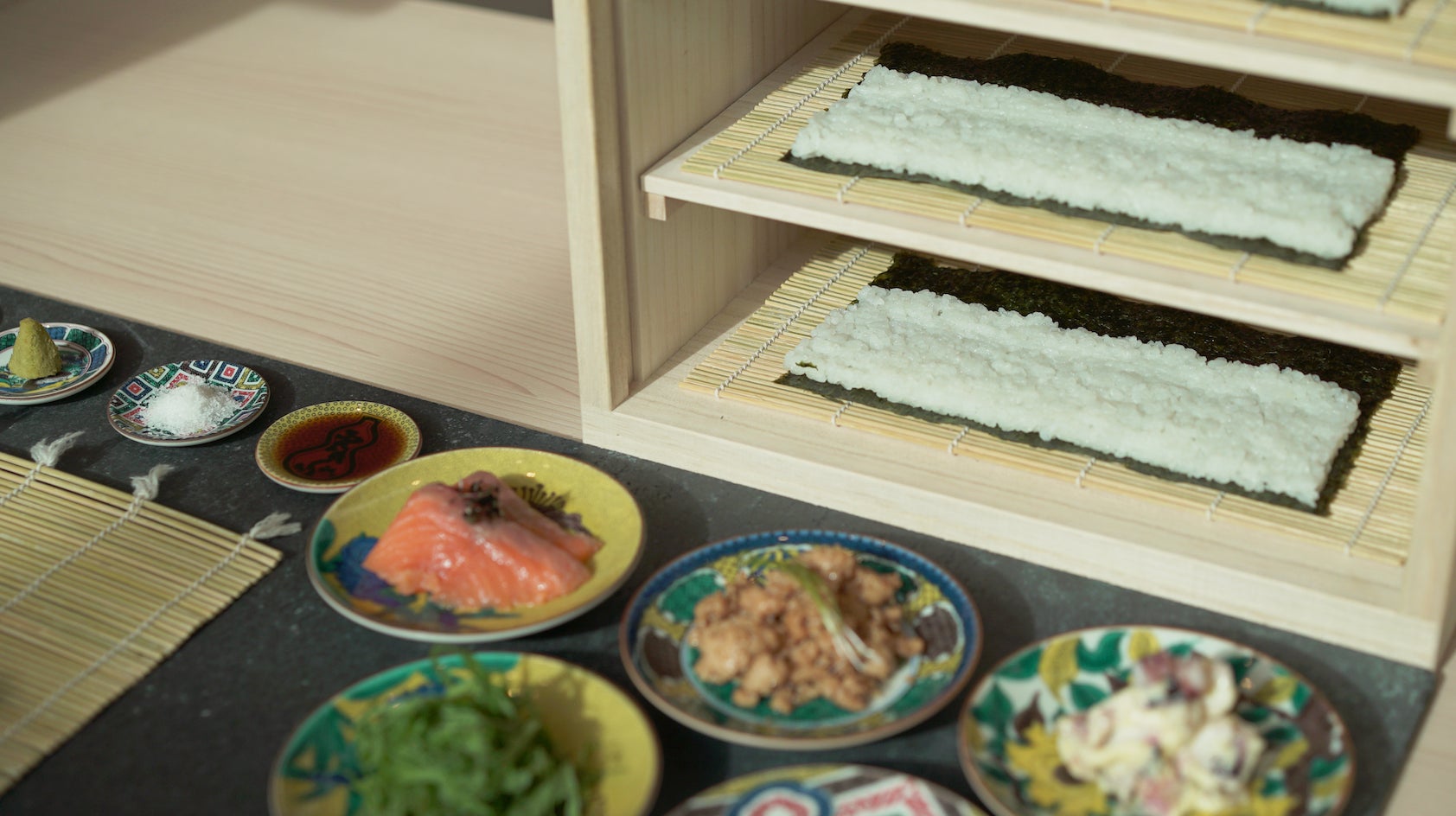 細巻き寿司を自分で巻いて楽しめる、Coilのメインセット。細巻き寿司・軍艦巻き・天ぷらに加え、抹茶を自分で点てて味わう体験つき。寿司ネタは約60種類から好きなもの(5種)を選べます。