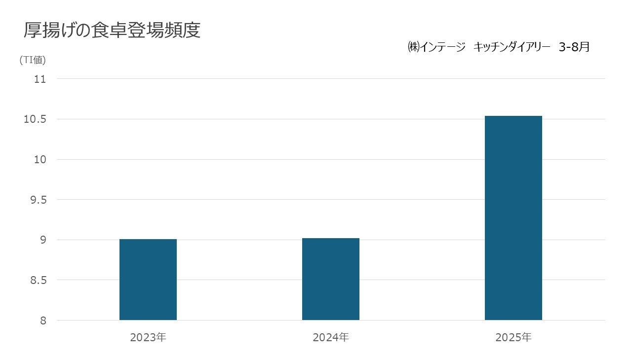 厚揚げの食卓登場頻度は前年比117%と伸長しており(㈱インテージ キッチンダイアリー 2025年3-8月)、その理由として「安価にたんぱく質が摂れる」「かさ増し食材として使いやすい」といった価格高騰を背景に家計に寄り添う定番食材として存在感を高めていることが挙げられます。しかし家庭における厚揚げのメニューはまだ少なく、炒め物の具材など使い方にはさらなる伸びしろがあると考えています。