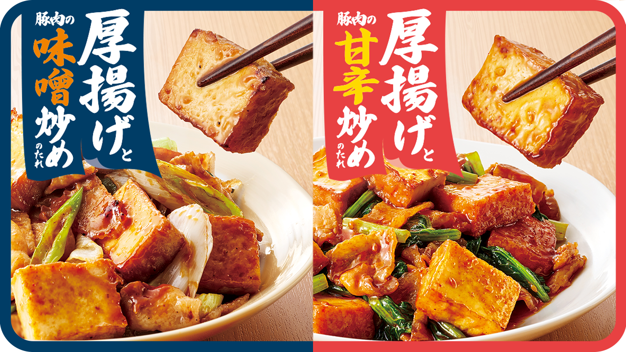 『厚揚げと豚肉の味噌炒めのたれ』『厚揚げと豚肉の甘辛炒めのたれ』新しいパッケージと味わいで登場※KSP-POS(全国)3-8月 当社厚揚げ炒めシリーズ