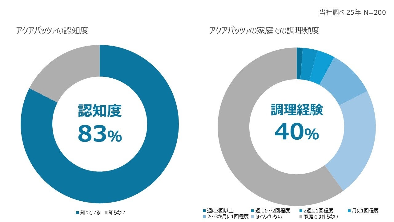 アクアパッツァの認知度は2025年に80%以上と年々認知率が増えているメニューですが(当社調べ 2025年 N=200)、家庭での調理経験としては40%程度とかなり少ない状況となっています。アクアパッツァを家庭で調理しない理由としては、「調理の手間がかかる」「調理方法がわからない」「どの魚種をつかったらいいのかわからない」といった回答が挙げられており(当社調べ 2025年 N=200)、調理ハードルが高いメニューだと生活者から認識されていることがわかりました。