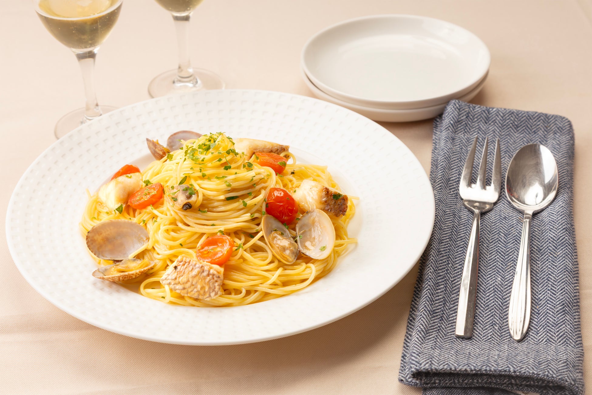 魚介の旨みを最後まで楽しむ〆パスタ!別茹でしたパスタを和えるだけで完成します。