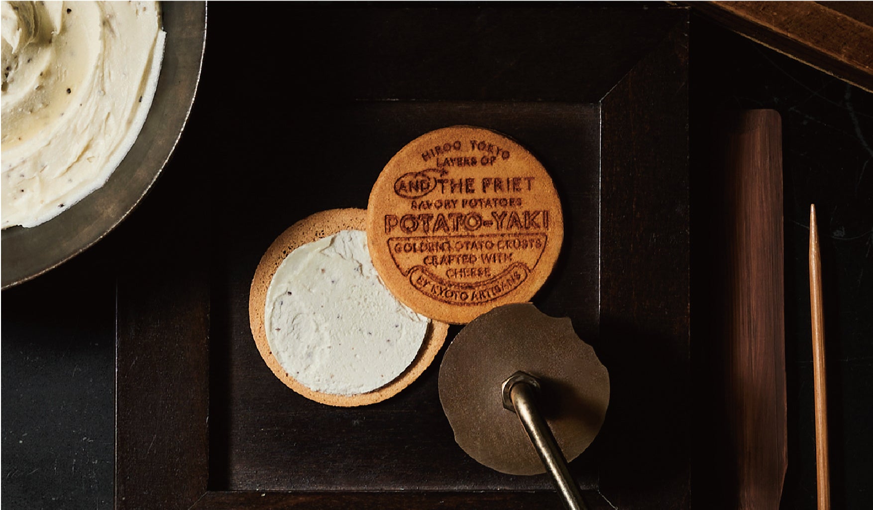 御芋焼は、じゃがいもをベースにオニオンやペッパーを練り込んだ生地を、京都に100年以上伝わる伝統的な京せんべいの製法で職人が一枚一枚丁寧に焼き上げた新発想のポテトスナックならぬ“御芋菓子”。サクッと軽やかな歯ごたえの生地には、黒トリュフの風味豊かなカマンベールチーズクリームをサンドしました。ほんのり上品な甘みの中にも芋の旨味、ペッパーのアクセントが織りなす和と洋のハーモニーは、ありそうでなかった新鮮な味わいです。