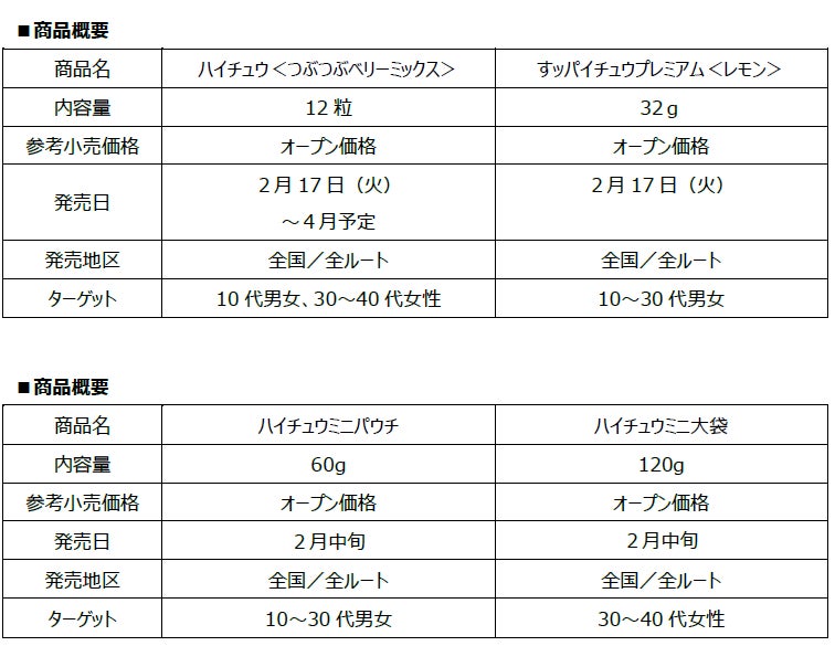 森永製菓株式会社(東京都港区芝浦、代表取締役社長 COO・森 信也)は、心地よい食感とジューシーな味わいが特長のソフトキャンディ「ハイチュウ」から、3種のベリーのおいしさとつぶつぶ食感がひと粒で味わえる「ハイチュウ<つぶつぶベリーミックス>」、もちもち食感とカリじゅわ食感の両立を実現した「すッパイチュウプレミアム<レモン>」を2 月 17 日(火)より新発売いたします。また、炭酸ドリンクフレーバーとハードな噛み心地が魅力の「ハイチュウミニ」を2 月中旬よりリニューアル発売いたします。