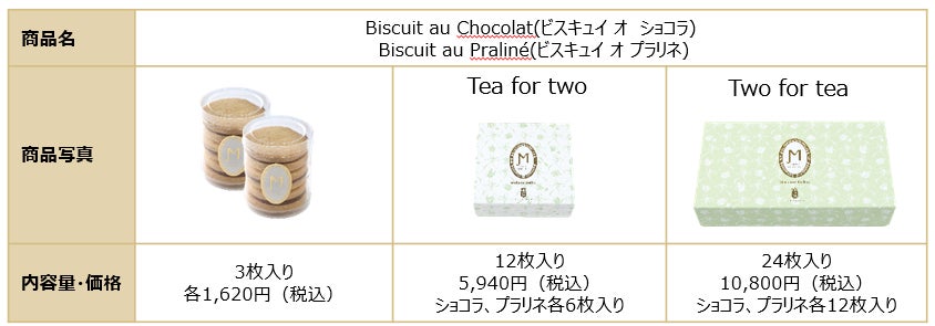 ミルクショコラをサンドした「Biscuit au Chocolat(ビスキュイ オ ショコラ) 」と、ナッツが香ばしいプラリネをサンドした「 Biscuit au Praliné(ビスキュイ オ プラリネ) 」の2種類の味をご用意しました。BOXは、1920年代の舞台挿入歌として作曲され、1950年代にミュージカル・コメディ『Tea for two(二人でお茶を)』で人気となった歌、『Tea for two』からインスピレーションを受けてデザインされています。
