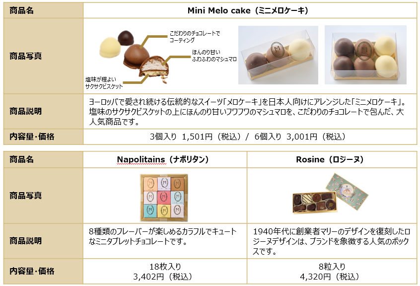 また、ミルクショコラをサンドした「Biscuit au Chocolat(ビスキュイ オ ショコラ)」と、ナッツが香ばしいプラリネをサンドした「Biscuit au Praliné(ビスキュイ オ プラリネ)」の2種類の味を楽しめるビスケットサンドや、昨年発売し人気を博した「ミニメロケーキ」なども発売いたします。さらに、百貨店催事4店舗(※2)では、マダムドリュックのクーベルチュールを贅沢に使用したソフトクリーム「Luxe Chocolat Soft cream」や苺とショコラのマリアージュが楽しめる「Fraises et chocolat」も販売いたします。