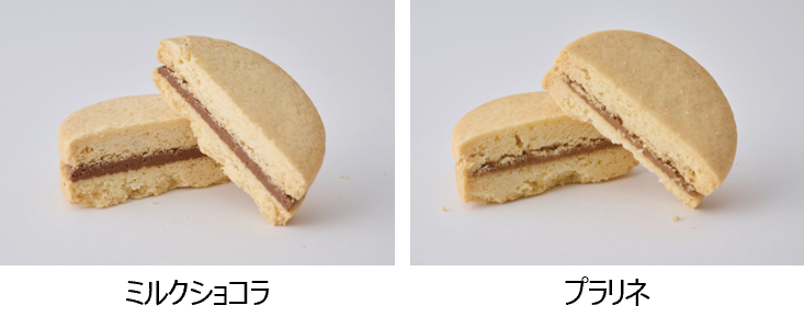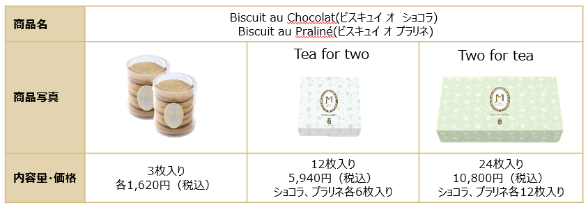 ミルクショコラをサンドした「Biscuit au Chocolat(ビスキュイ オ ショコラ) 」と、ナッツが香ばしいプラリネをサンドした「 Biscuit au Praliné(ビスキュイ オ プラリネ) 」の2種類の味をご用意しました。BOXは、1920年代の舞台挿入歌として作曲され、1950年代にミュージカル・コメディ『Tea for two(二人でお茶を)』で人気となった歌、『Tea for two』からインスピレーションを受けてデザインされています。