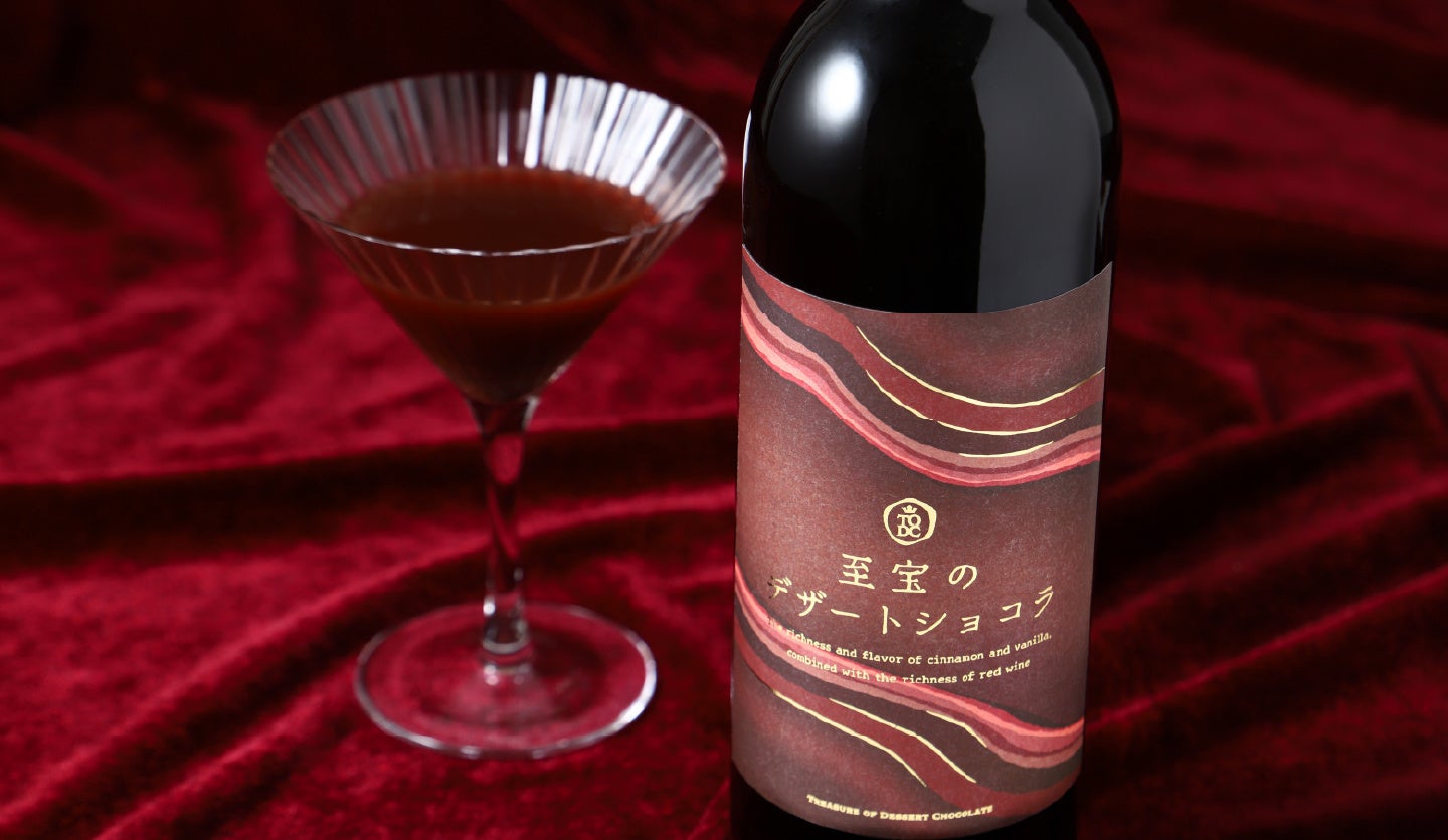 「至宝のデザートショコラ」は、まるでデパートに並ぶ「高級チョコレート」のように特別感のあるチョコレートをイメージして開発したリキュールです。ペアリングとしても相性の良い組み合わせとして鉄板のチョコレートと赤ワインに着目し、和歌山県の実力派ワイナリーが製造を担います。ワイナリー自慢の赤ワインをベースに、シナモンやバニラを加えることで、チョコレートの深みや立体感が広がる1本をつくりました。