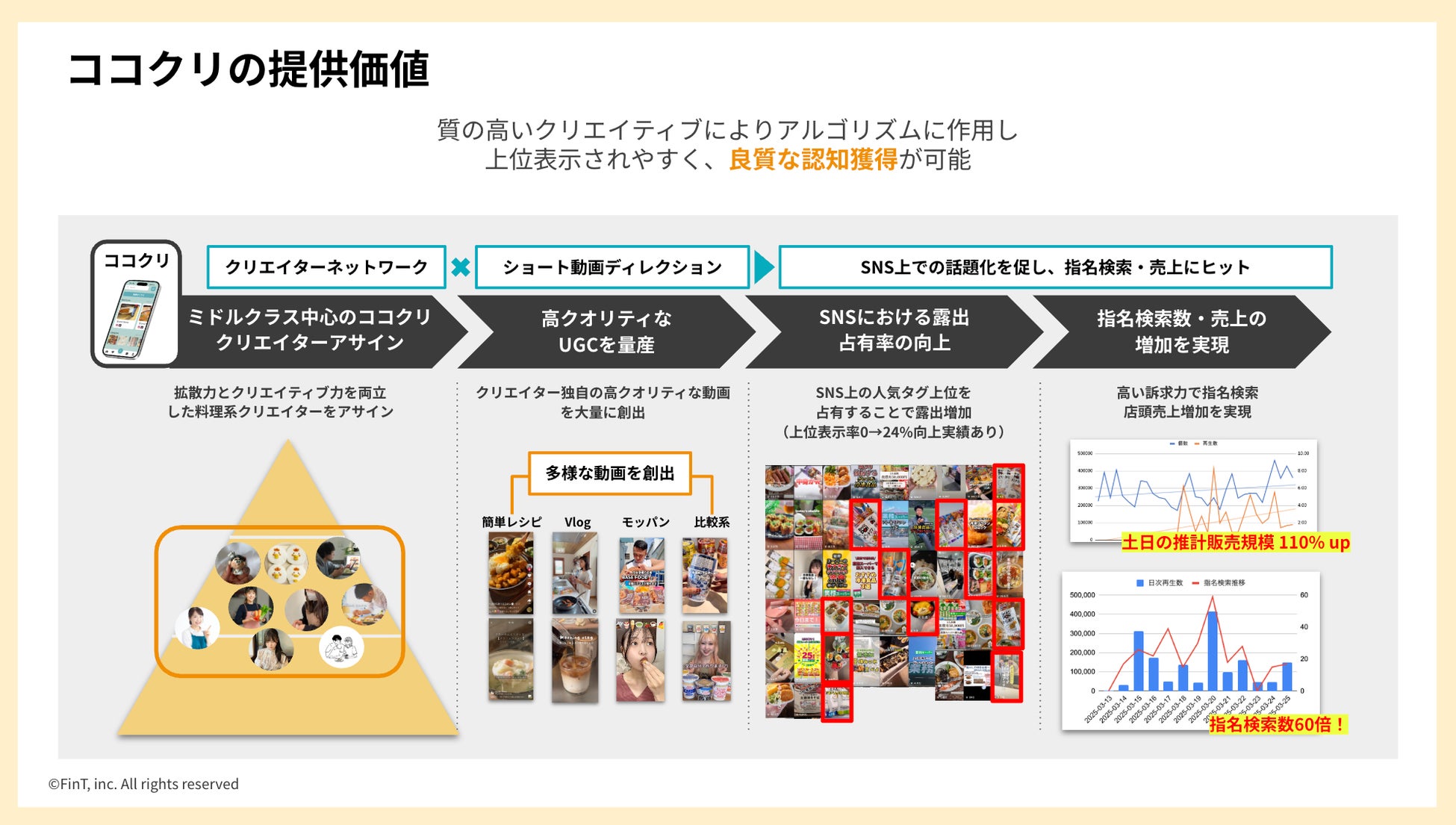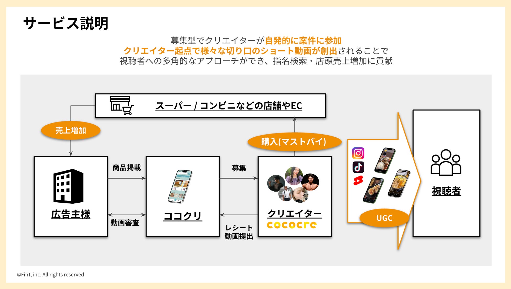 株式会社FinT(本社:東京都渋谷区、代表取締役:大槻祐依)が運営するクリエイターマッチングサービス『ココクリ』は、ショート動画に強みを持つ口コミ創出サービスです。食品飲料に関心のある750名のクリエイターが所属しており、SNSでの良質な口コミを創出し、企業の商品プロモーションを効果的に支援します。