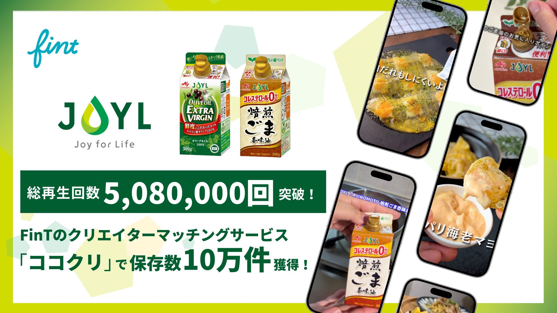 株式会社J-オイルミルズが展開する紙パック入り食用油「スマートグリーンパック®」シリーズのJOYL「AJINOMOTO ブランド オリーブオイルエクストラバージン」およびJOYL「AJINOMOTO ブランド 焙煎ごま香味油」のプロモーションとして『ココクリ』が活用され、多数のミドルクリエイターがSNSにPR動画を投稿しました。結果として、63件のUGCを創出し、5,088,620回の合計再生数を達成。保存数も98,268件(平均1,786件)で保存率1.93%と過去最高値の約4倍の記録となり、従来のフォロワー単価型タイアップと比べて約20%以下の費用でブランドの認知を拡大させることができました。