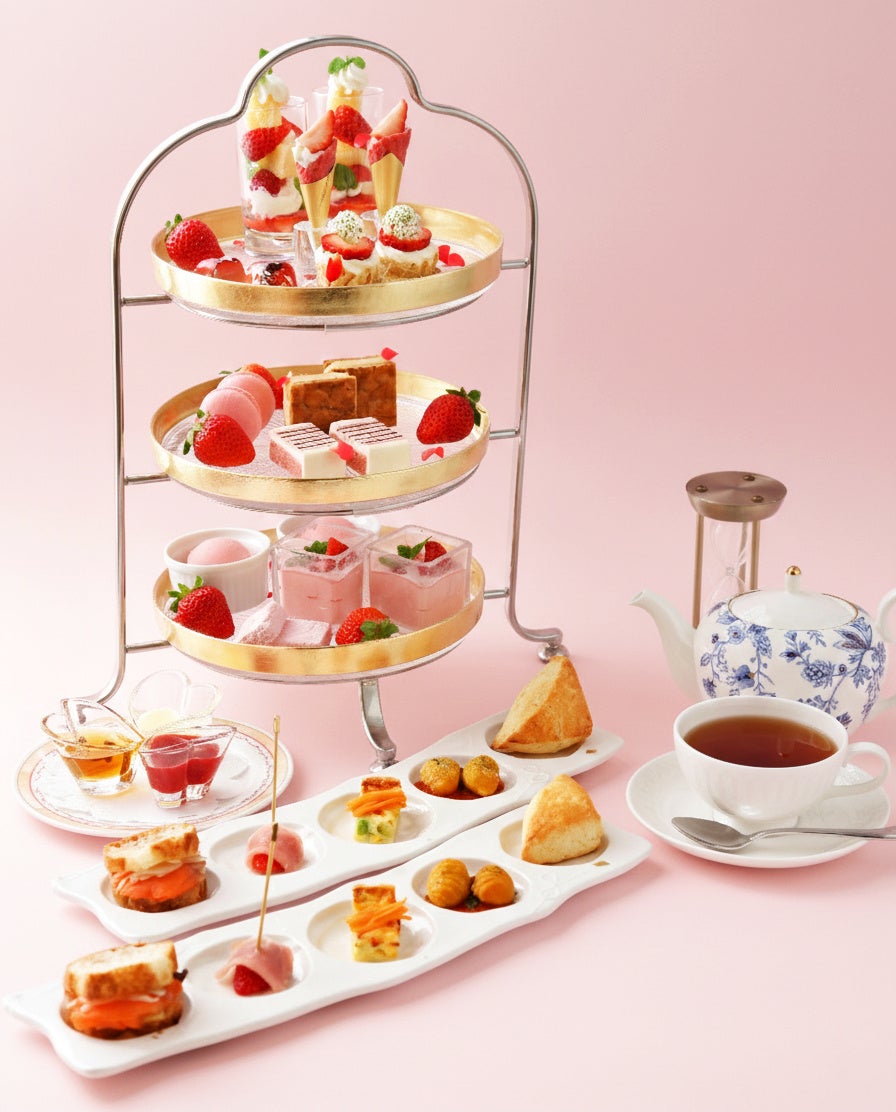 定番のショートケーキやミルフィーユなど、約20種の彩り豊かなスイーツのほか、イチゴのスムージーや数種類のトッピングで楽しむパフェ、目の前で仕上げるいちごのフランベデザートも登場。さらに、シェフ特製オードブルやスープ、パスタやサンドイッチ、サラダなどのお食事メニューもビュッフェスタイルで15種ご用意いたします。