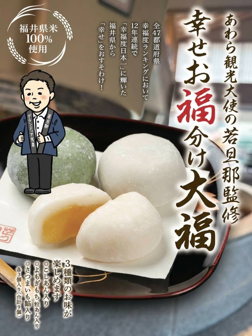 このたび、福井県芦原温泉のグランディア芳泉(所在地:福井県あわら市、以下 当館)では、温泉創業94年老舗菓子店とコラボをし『幸せのお福わけ大福』共同開発しました。