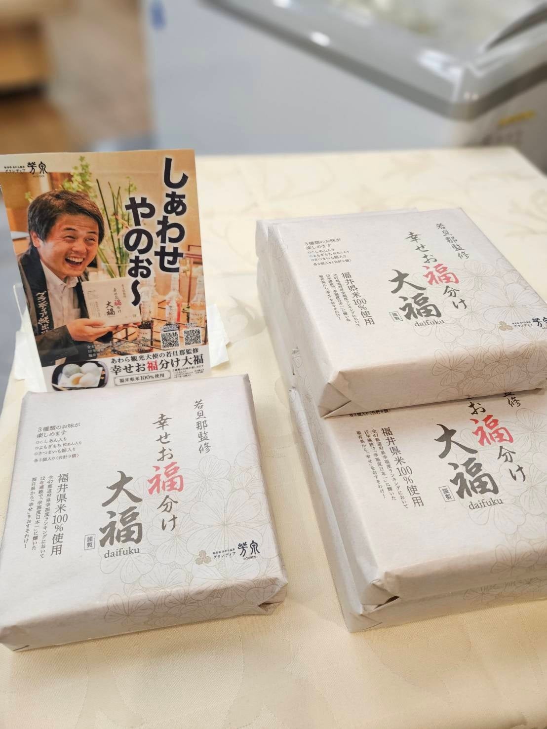 このたび、福井県芦原温泉のグランディア芳泉(所在地:福井県あわら市、以下 当館)では、温泉創業94年老舗菓子店とコラボをし『幸せのお福わけ大福』共同開発しました。