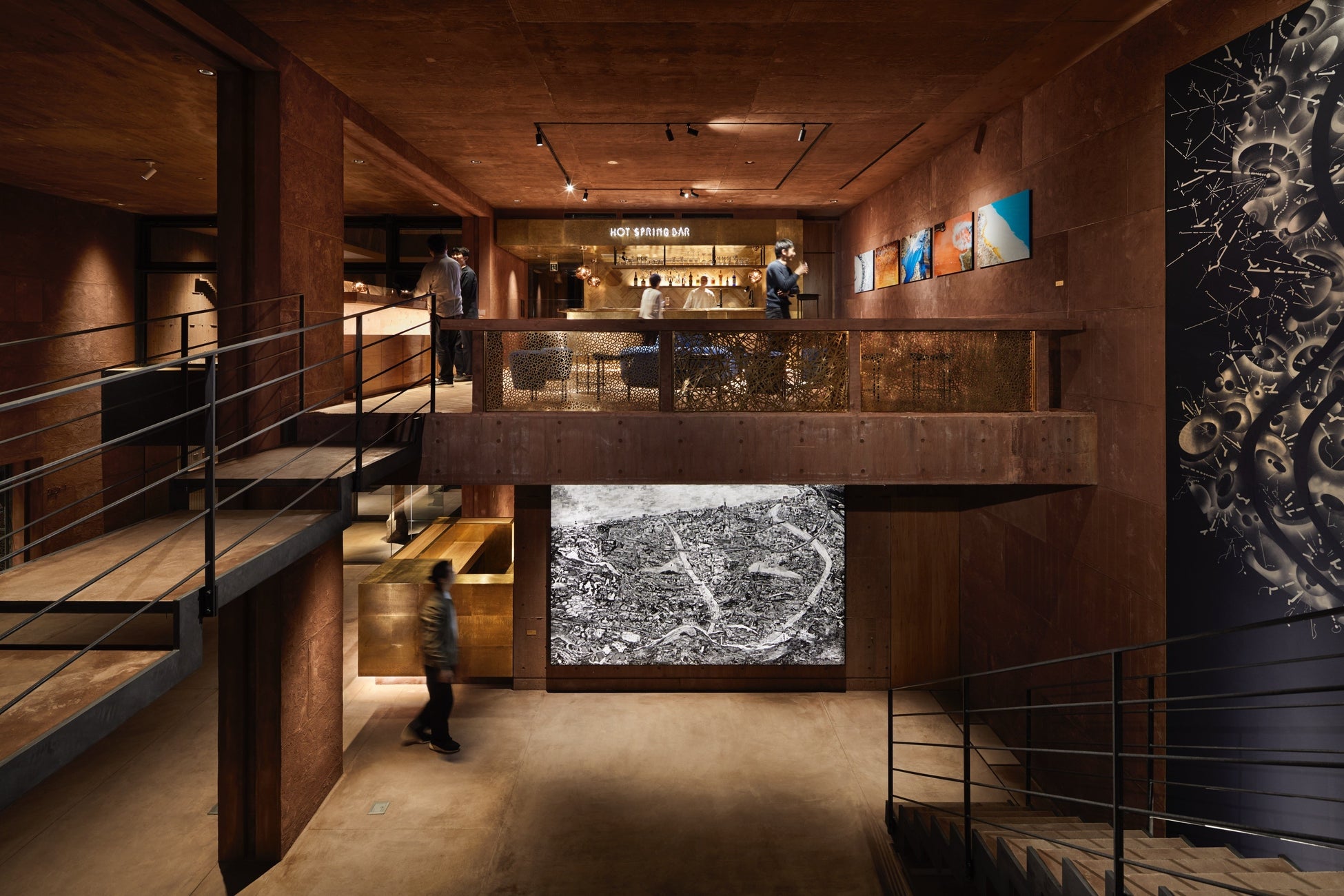 そこに広がるのは、別府の繁華街を感じさせる賑やかで華やかな社交場のような空間。バー厨房壁面には温泉水で変色した真鍮版、バーカウンターの天板には耳付きの国産オニグルミ無垢一枚板を使用。床面は国産オニグルミの無垢フローリングをヘリンボーン張りにして、華やかな印象と確かな質感を作り上げました。