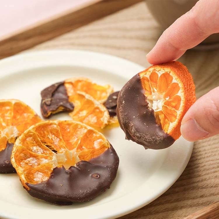 「半分だけ」のチョココーティング:あえてスイートチョコを半分だけに留めることで、重くなりすぎない絶妙なバランスに仕上げました。噛むほどにみかんの爽やかさが広がり、後からチョコのコクがゆっくりと重なる、変化のある味わいを楽しめます。