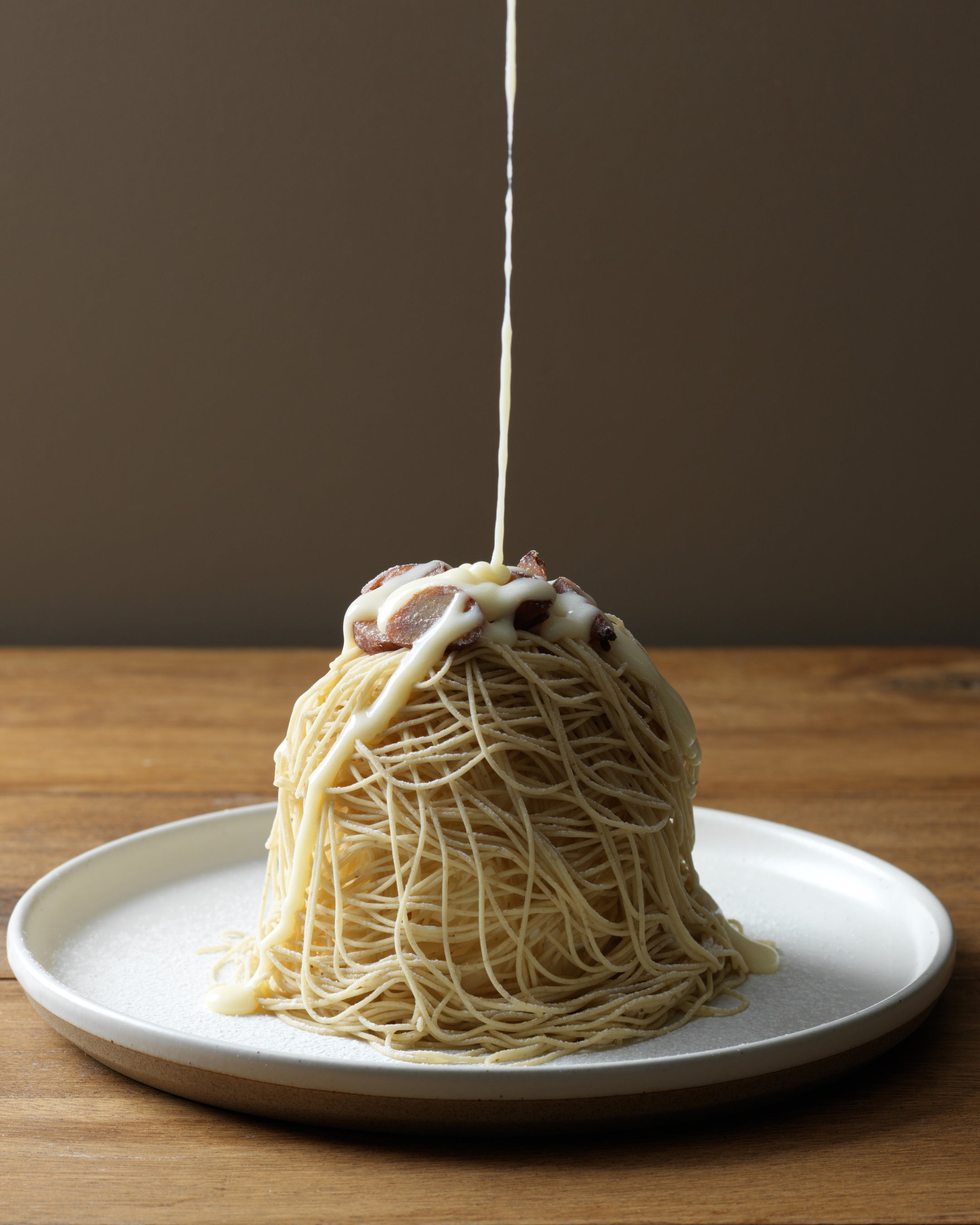 ジャージーミルクのソースをかけることで、さらにミルク感たっぷりの味わいを、お楽しみいただけます。絞りたてでしか味わえない、ふわり、ほろりとした繊細な食感と、栗とミルクの味わいの調和をぜひ、お楽しみください。