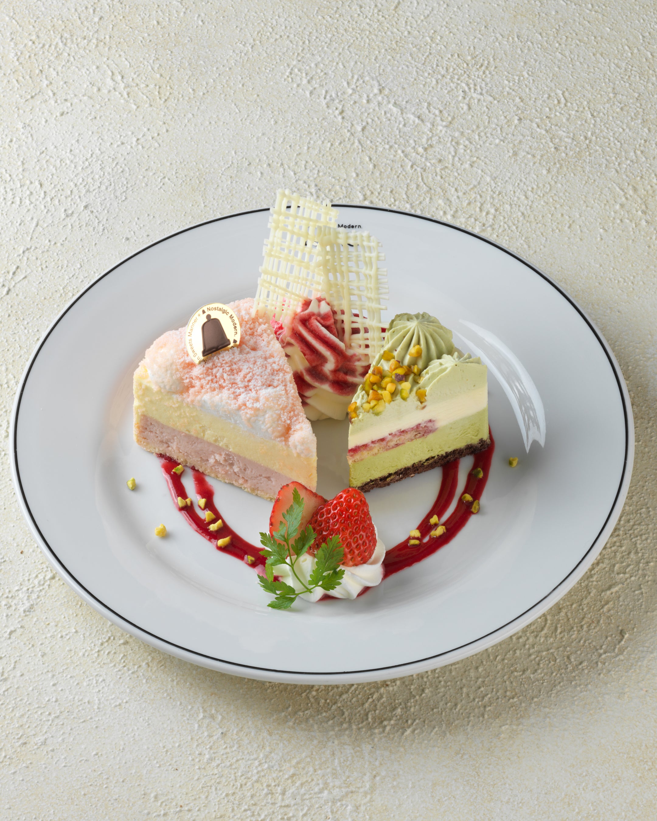 季節限定フレーバーのドゥーブルフロマージュ「フレーズドゥーブル」と 濃厚なピスタチオの味わいが特徴の「ピスタヴェール」が、一度にお楽しみいただける、春限定のスイーツプレート。