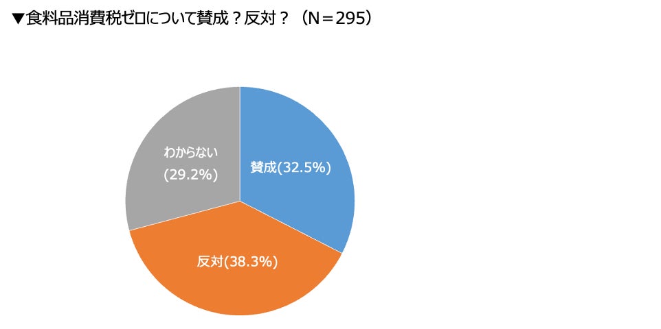 次に、「食料品の消費税ゼロ」について議論されていることを認識している飲食店に対し、賛否を聞いたところ、「賛成」(32.5%)、「反対」(38.3%)と意見は拮抗しつつも、反対がやや上回る結果となりました。